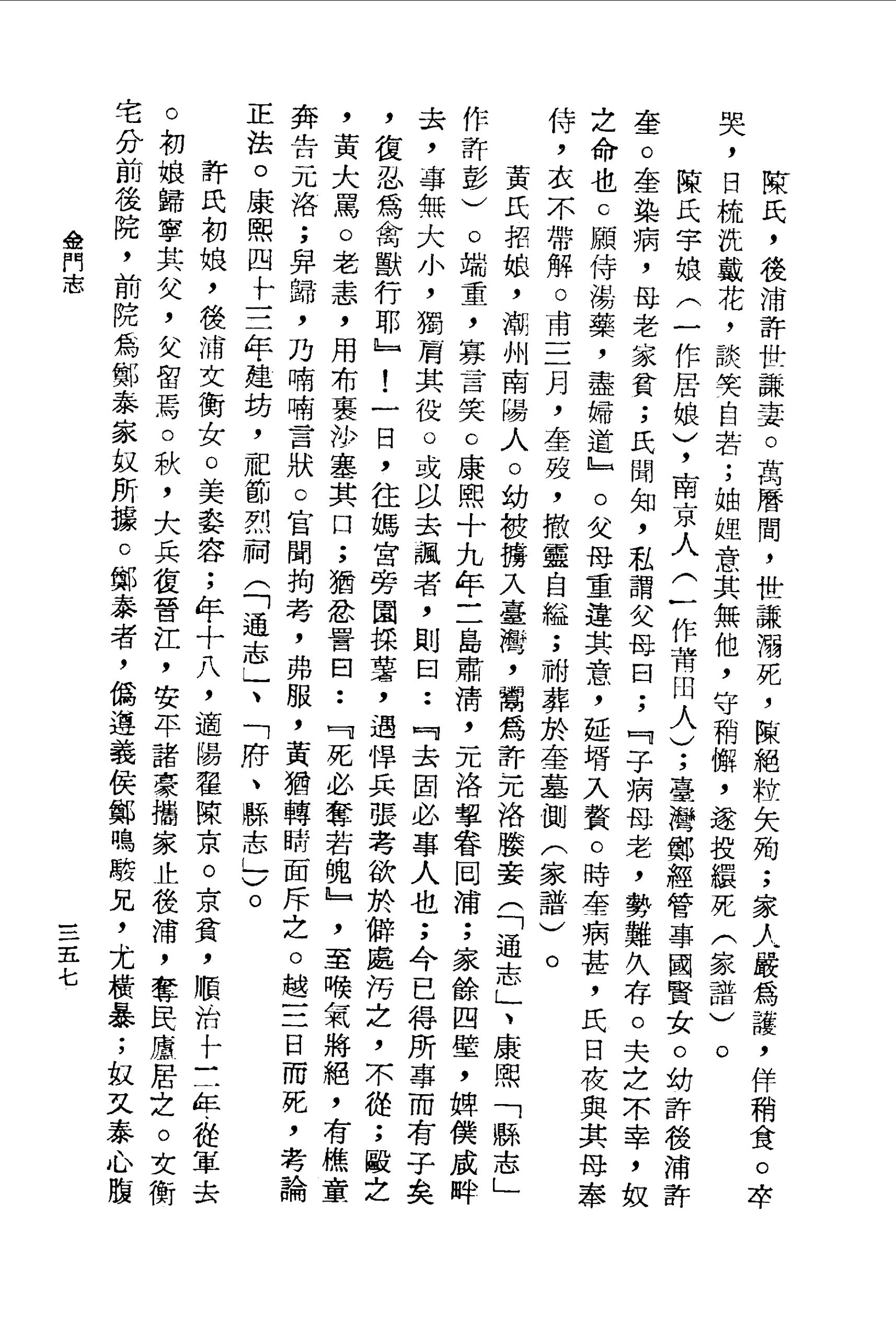陳氏宇娘(一作居娘),南京人(一作莆田人);臺灣鄭經管事國賢女。幼許後浦許奎。奎染病,母老家貧;氏聞知,私謂父母曰:『子病母老,勢難久存。夫之不幸,奴之命也。願侍湯藥,盡婦道』。父母重違其意,延壻入贅。時奎病甚,氏日夜與其母奉侍,衣不帶解。甫三月,奎歿,撤靈自縊;祔葬於奎墓側(家譜)。