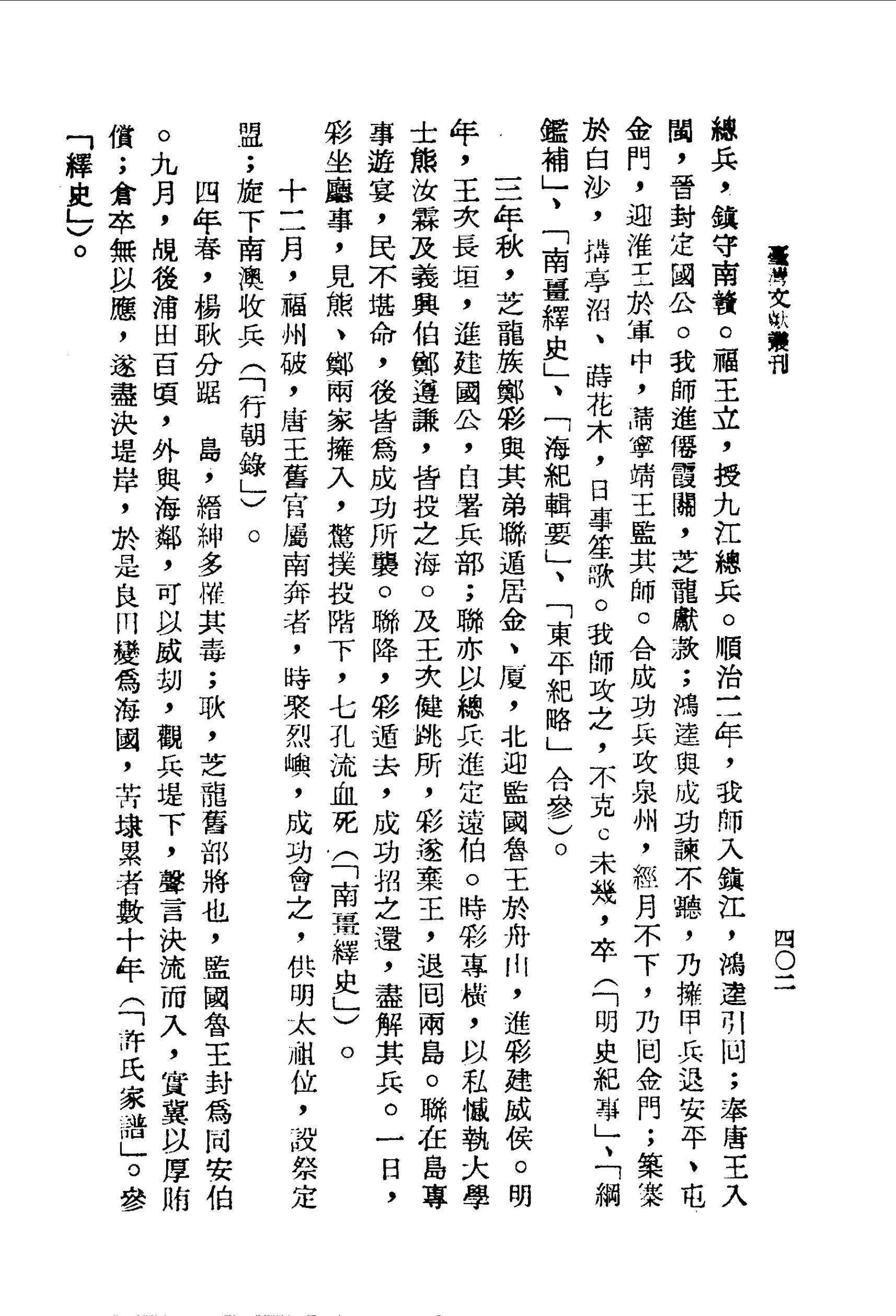 三年秋,芝龍族鄭彩與其弟聯遁居金、廈,北迎監國魯王於舟山,進彩建威侯。明年,王次長垣,進建國公,自署兵部;聯亦以總兵進定遠伯。時彩專橫,以私憾執大學士熊汝霖及義興伯鄭遵謙,皆投之海。及王次健跳所,彩遂棄王,退回兩島。聯在島專事遊宴,民不堪命,後皆為成功所襲。聯降,彩遁去,成功招之還,盡解其兵。一日,彩坐廳事,見熊、鄭兩家擁入,驚撲投階下,七孔流血死(「南畺繹史」)。
