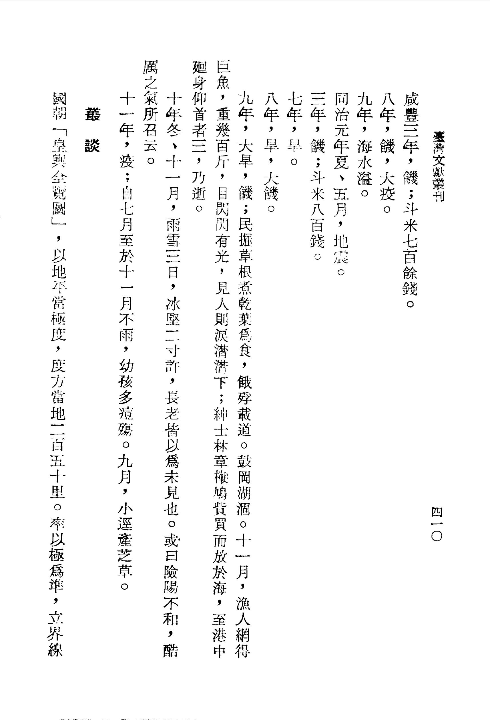 咸豐三年,饑;斗米七百餘錢。 八年,饑,大疫。 九年,海水溢。
