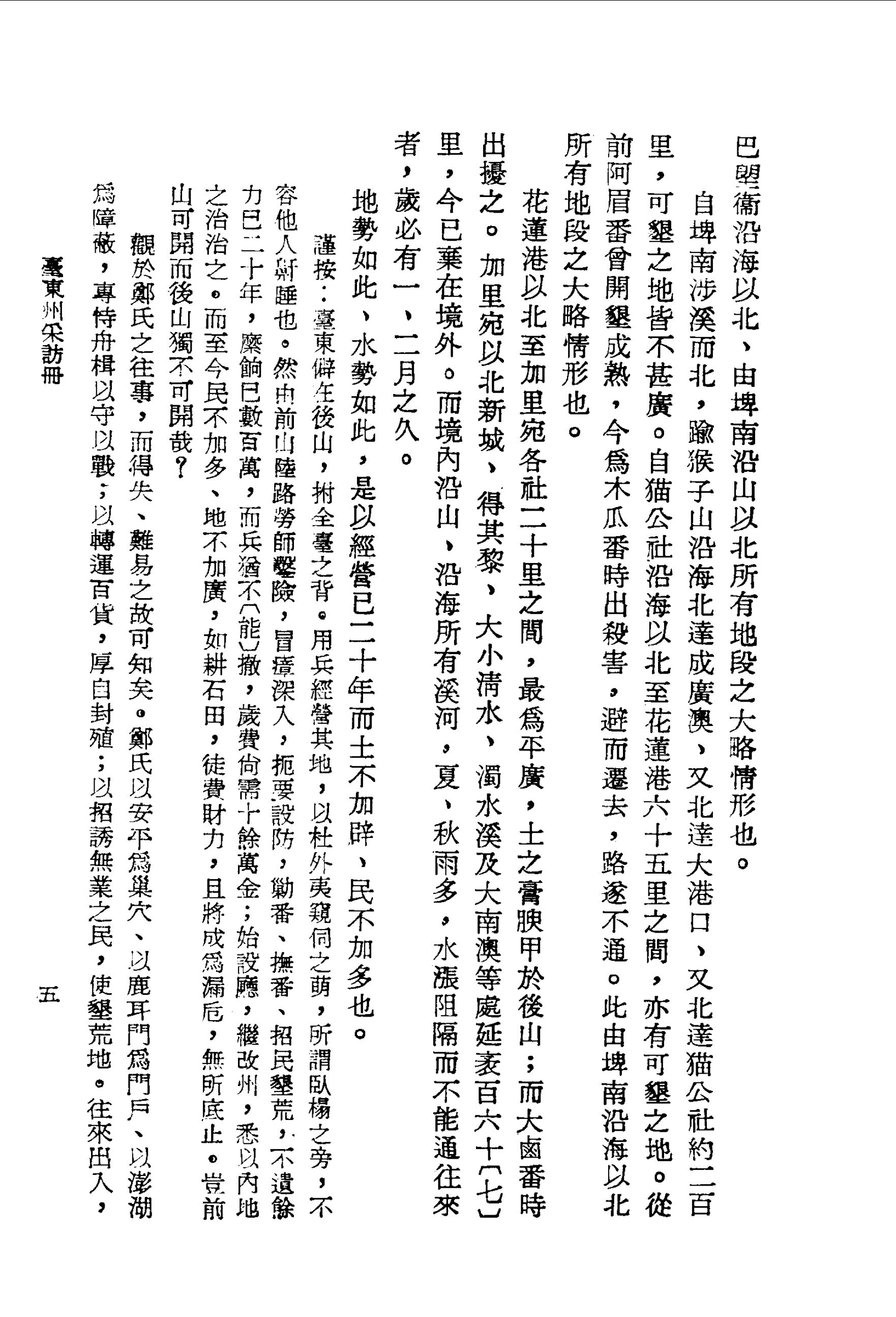 臺東僻在後山,拊全臺之背。用兵經營其地,以杜外夷窺伺之萌,所謂臥榻之旁,不容他人鼾睡也。然由前山陸路勞師鑿險,冒瘴深入,扼要設防,勦番、撫番、招民墾荒,不遺餘力已二十年,縻餉已數百萬,而兵猶不能撤,歲費尚需十餘萬金;始設廳,繼改州,悉以內地之治治之。而至今民不加多、地不加廣,如耕石田,徒費財力,且將成為漏卮,無所底止。豈前山可開而後山獨不可開哉?