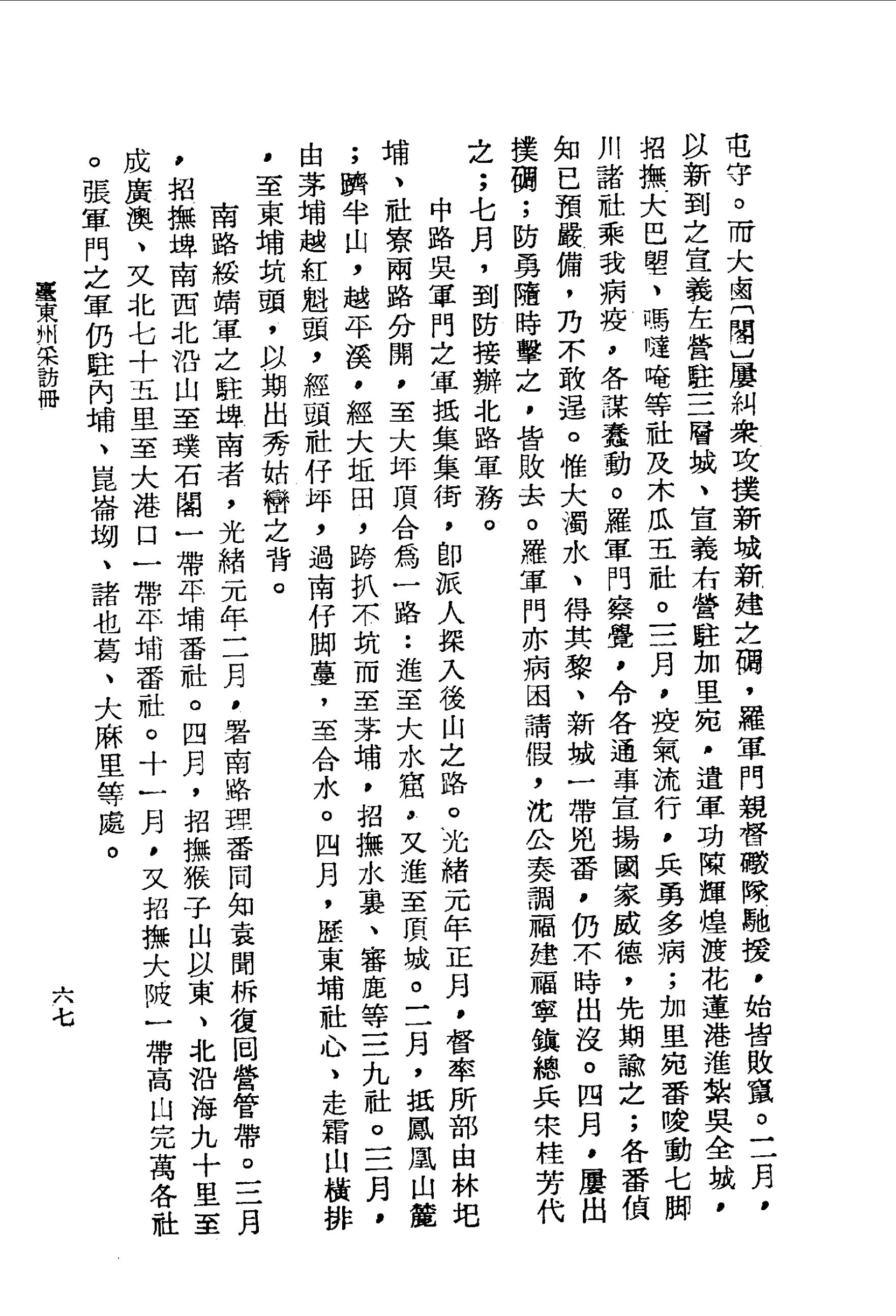 三月,疫氣流行,兵勇多病;加里宛番唆動七腳川諸社乘我病疫,各謀蠢動。羅軍門察覺,令各通事宣揚國家威德,先期諭之;各番偵知已預嚴備,乃不敢逞。惟大濁水、得其黎、新城一帶兇番,仍不時出沒。