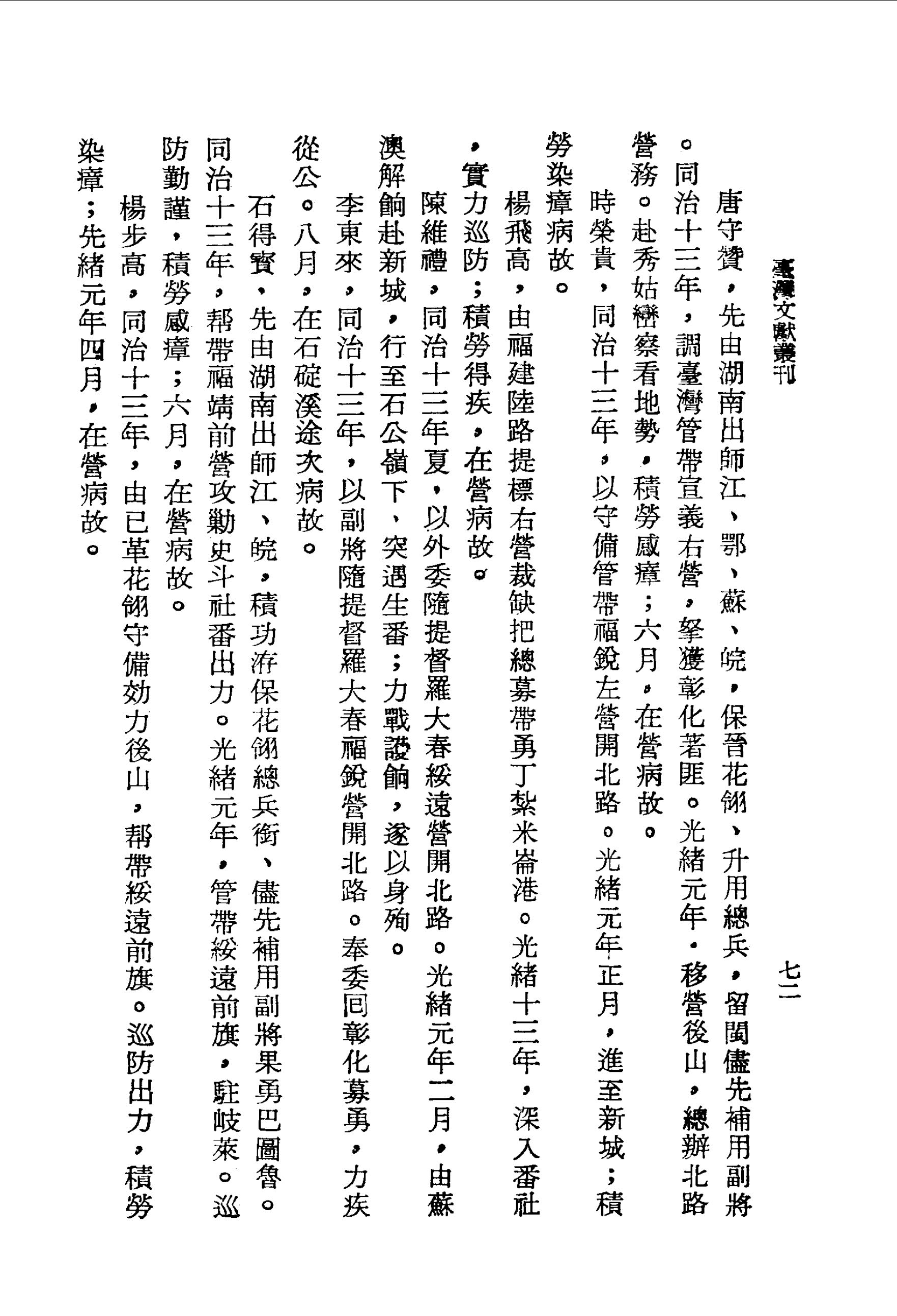 楊步高,同治十三年,由已革花翎守備效力後山,幫帶綏遠前旗.巡防出力,積勞染瘴;光緒元年四月,在營病故。
