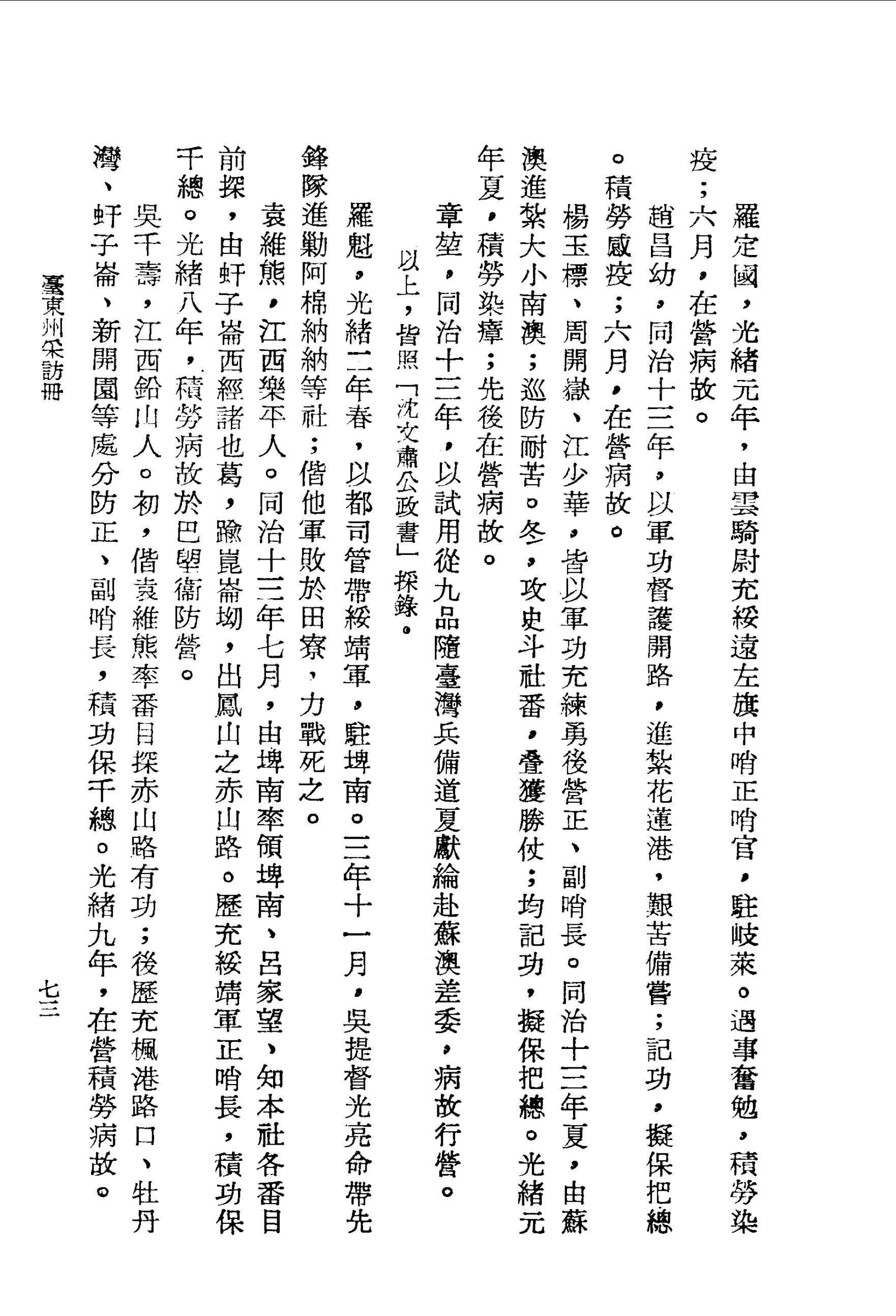 楊玉標、周開嶽、江少華,皆以軍功充練勇後營正、副哨長.同治十三年夏,由蘇澳進紮大小南澳;巡防耐苦.冬,攻史斗社番,疊獲勝仗;均記功,擬保把總.光緒元年夏,積勞染瘴;先後在營病故.