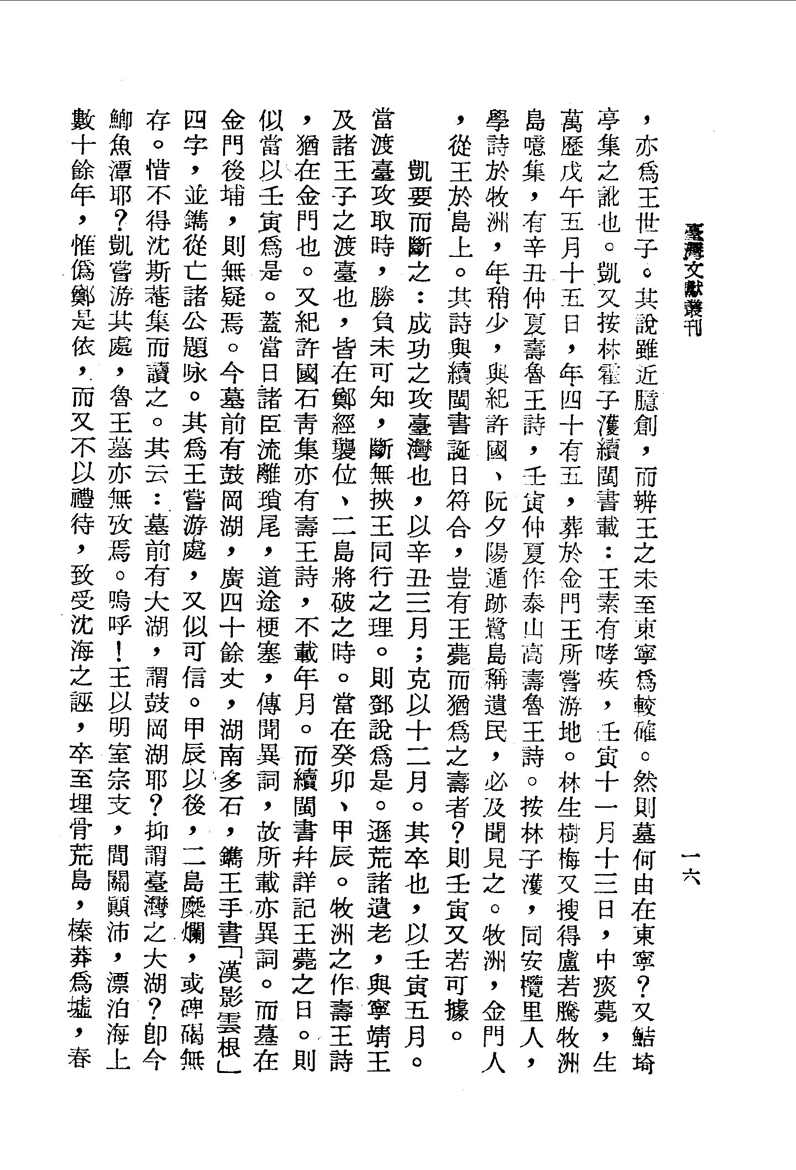 凱又按林霍子濩續閩書載:王素有哮疾,壬寅十一月十三日,中痰薨,生萬歷戊午五月十五日,年四十有五,葬於金門王所嘗游地。林生樹梅又搜得盧若騰牧洲島噫集,有辛丑仲夏壽魯王詩,壬寅仲夏作泰山高壽魯王詩。按林子濩,同安欖里人,學詩於牧洲,年稍少,與紀許國、阮夕陽遁跡鷺島稱遺民,必及聞見之。牧洲,金門人,從王於島上。其詩與續閩書誕日符合,豈有王薨而猶為之壽者?則壬寅又若可據。