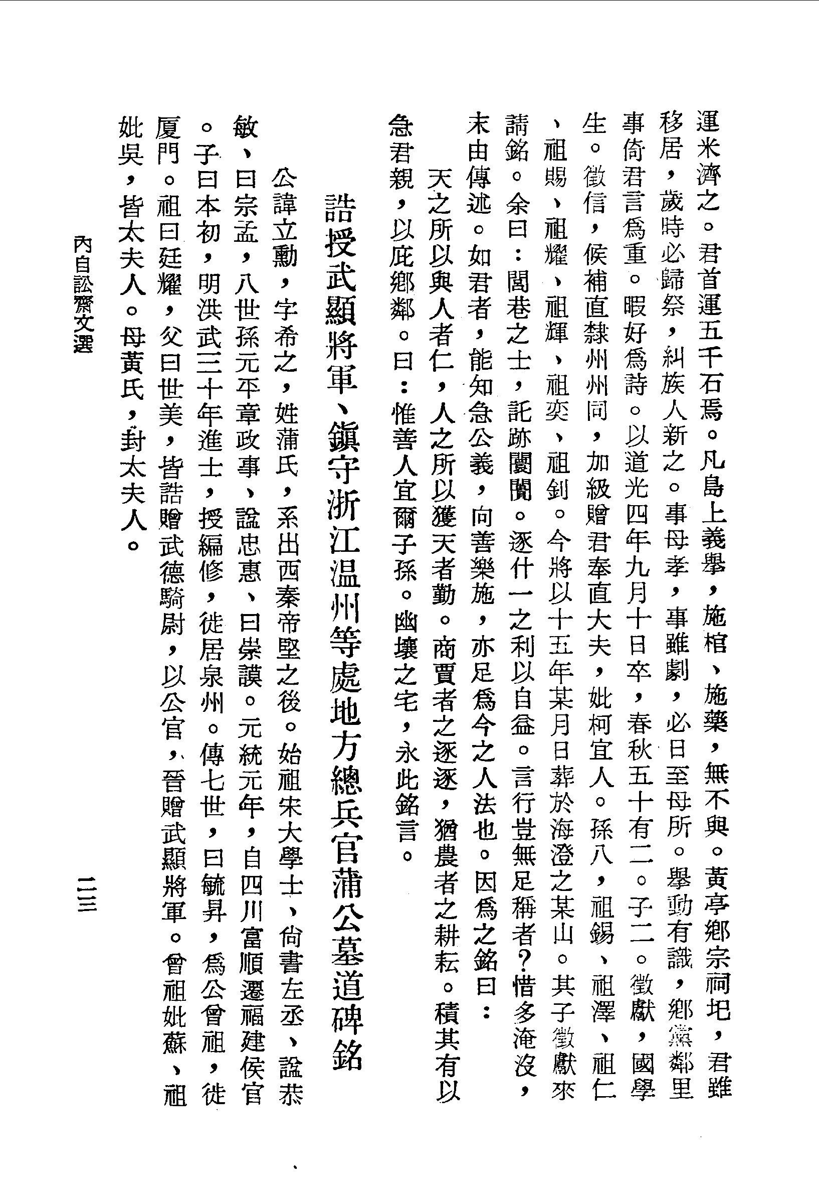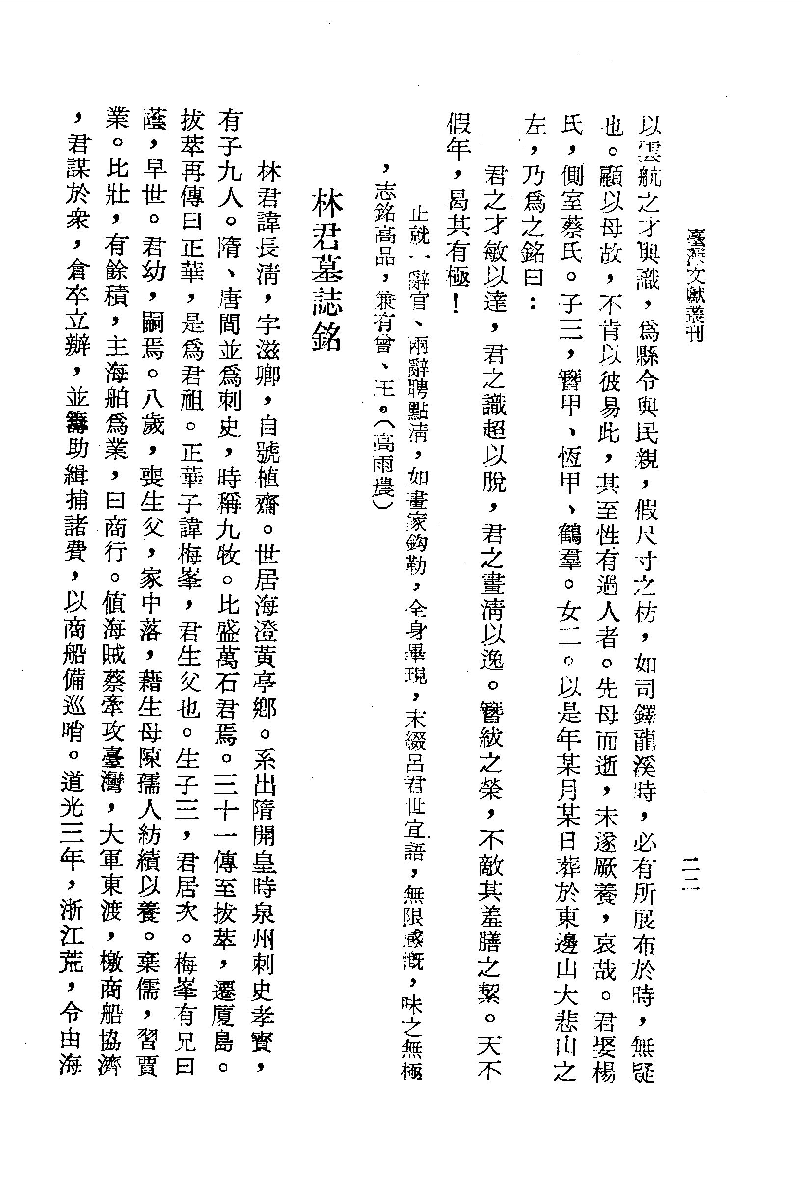 值海賊蔡牽攻臺灣,大軍東渡,檄商船協濟,君謀於眾,倉卒立辦,並籌助緝捕諸費,以商船備巡哨。道光三年,浙江荒,令由海運米濟之。君首運五千石焉。凡島上義舉,施棺、施藥,無不與。黃亭鄉宗祠圯,君雖移居,歲時必歸祭,糾族人新之。事母孝,事雖劇,必日至母所。舉動有識,鄉黨鄰里事倚君言為重。暇好為詩。