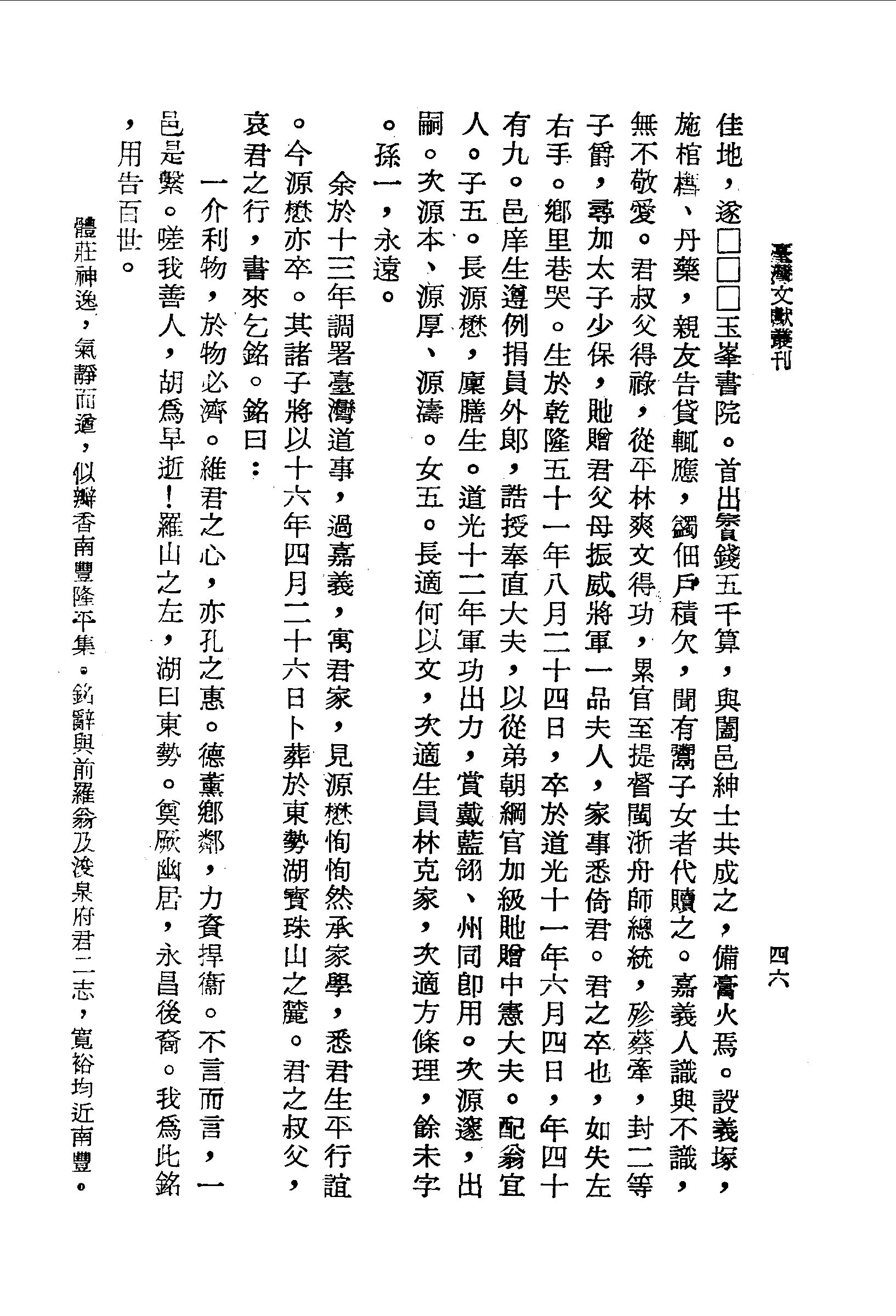 遂□□□玉峰書院。首出賨錢五千算,與闔邑紳士共成之,備膏火焉。設義塚,施棺槥、丹藥,親友告貸輒應,蠲佃戶積欠,聞有鬻子女者代贖之。嘉義人識與不識,無不敬愛。