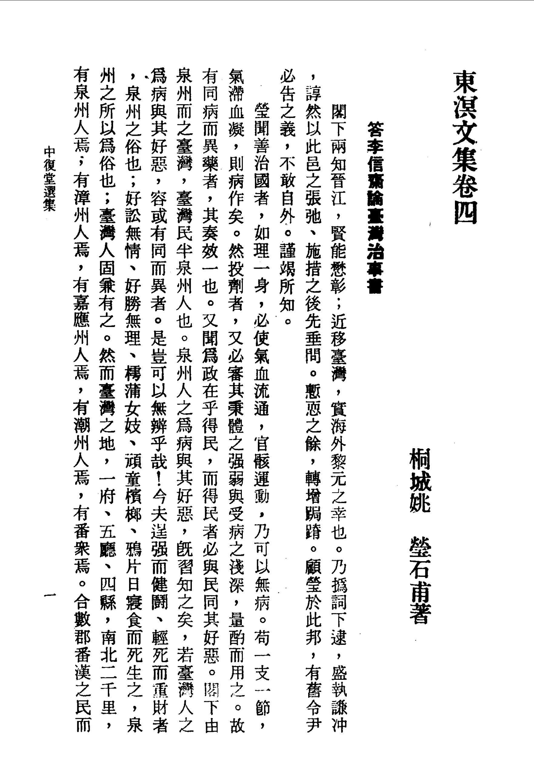 瑩聞善治國者,如理一身,必使氣血流通,官骸運動,乃可以無病。苟一支一節,氣滯血凝,則病作矣。然投劑者,又必審其秉體之強弱與受病之淺深,量酌而用之。故有同病而異藥者,其奏效一也。又聞為政在乎得民,而得民者必與民同其好惡。閣下由泉州而之臺灣,臺灣民半泉州人也。泉州人之為病與其好惡,既習知之矣,若臺灣人之為病與其好惡,容或有同而異者。是豈可以無辨乎哉!今夫逞強而健鬥、輕死而重財者,泉州之俗也;好訟無情、好勝無理、樗蒲女妓、頑童檳榔、鴉片日寢食而死生之,泉州之所以為俗也;臺灣人固兼有之。然而臺灣之地,一府、五廳、四縣,南北二千里,有泉州人焉,有漳州人焉,有嘉應州人焉,有潮州人焉,有番眾焉。