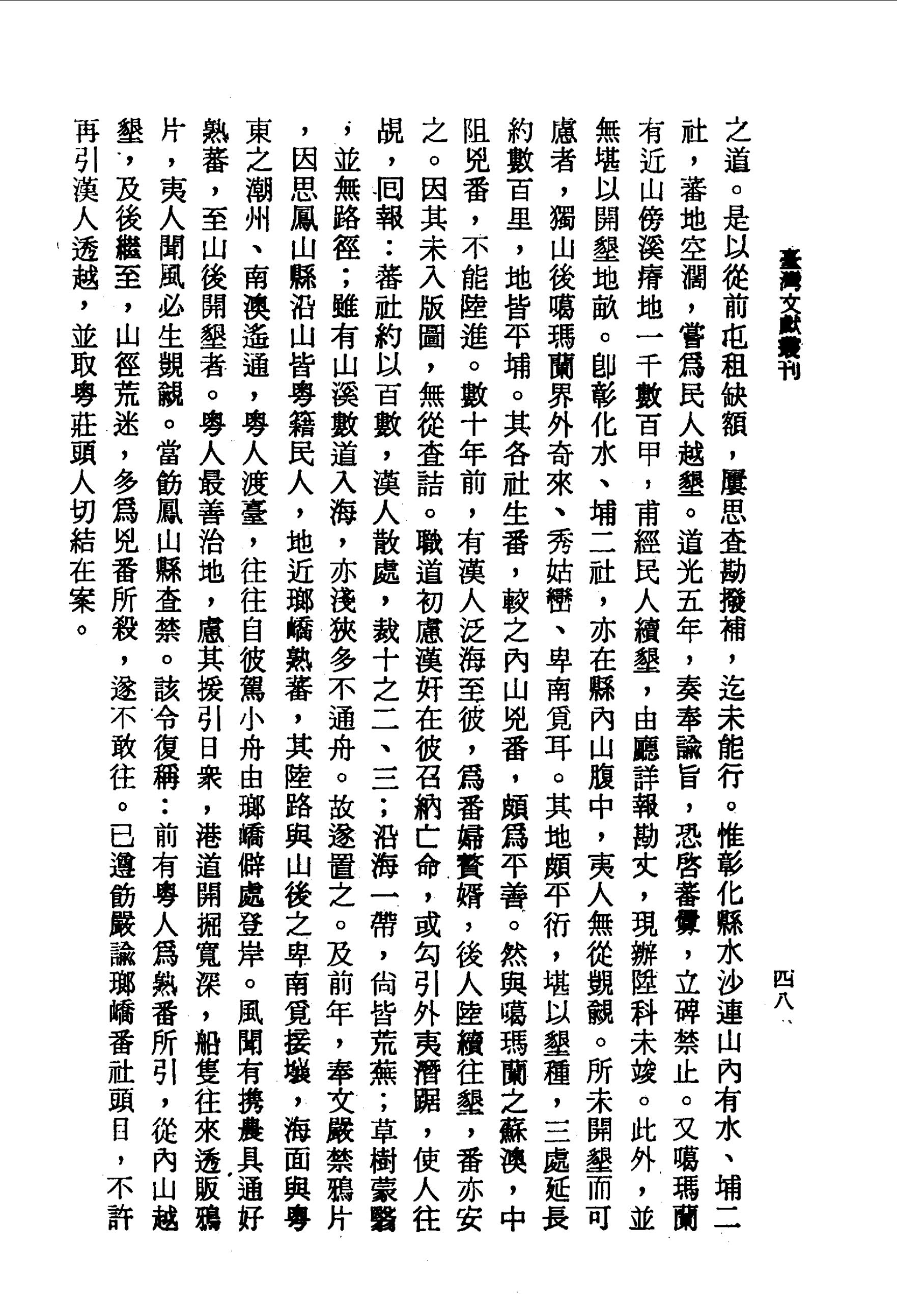 及前年,奉文嚴禁鴉片,因思鳳山縣沿山皆粵籍民人,地近瑯嶠熟蕃,其陸路與山後之卑南覓接壤,海面與粵東之潮州、南澳遙通,粵人渡臺,往往自彼駕小舟由瑯嶠僻處登岸。風聞有攜農具通好熟蕃,至山後開墾者。粵人最善治地,慮其援引日眾,港道開掘寬深,船隻往來透販鴉片,夷人聞風必生覬覦。當飭鳳山縣查禁。該令復稱:前有粵人為熟番所引,從內山越墾,及後繼至,山徑荒迷,多為兇番所殺,遂不敢往。
