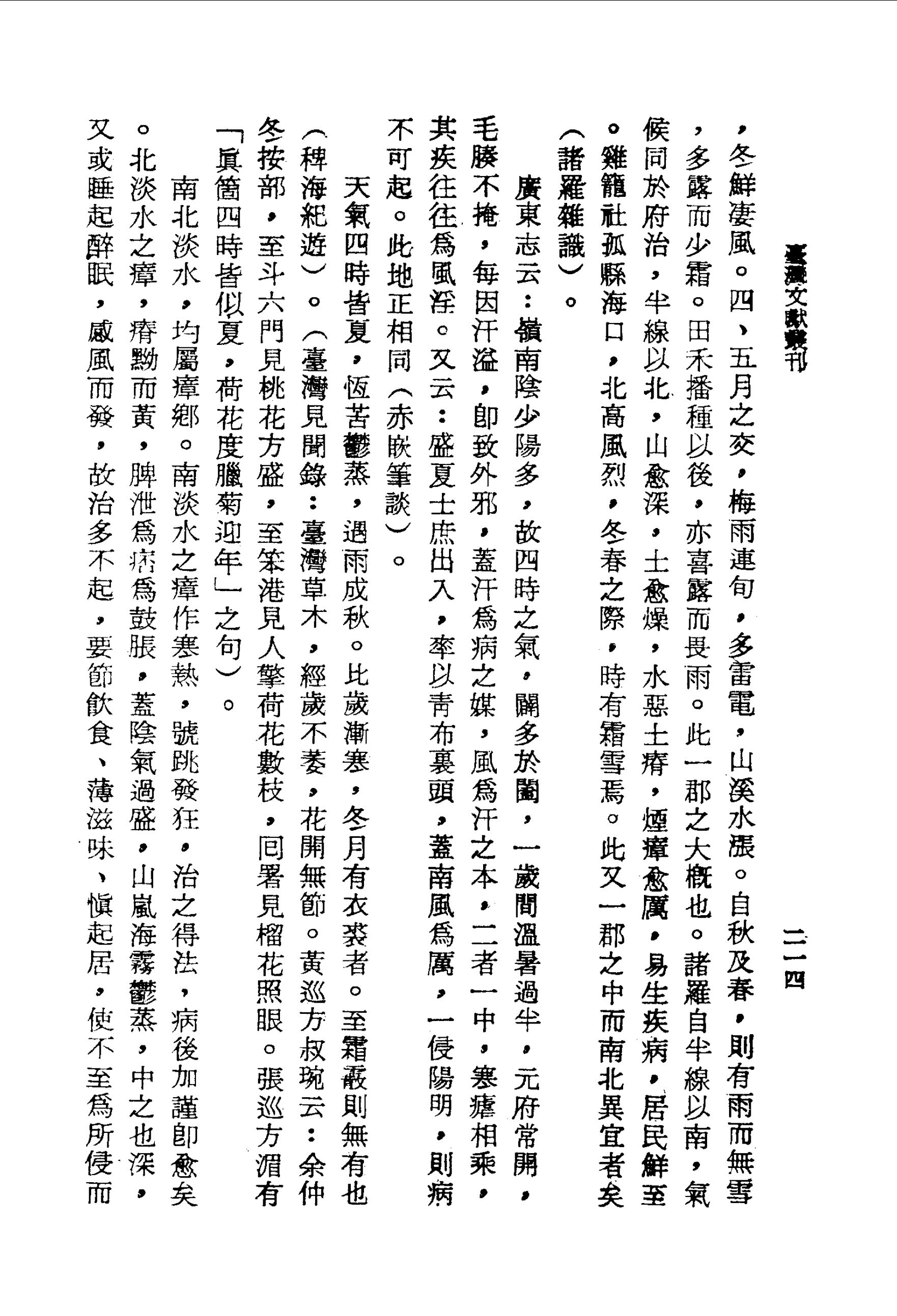 南北淡水,均屬瘴鄉。南淡水之瘴作寒熱,號跳發狂,治之得法,病後加謹即愈矣。北淡水之瘴,瘠黝而黃,牌泄為痞為鼓脹,蓋陰氣過盛,山風海霧鬱蒸,中之也深,又或睡起醉眠,感風而發,故治多不起,要節飲食、薄滋味、慎起居,使不至為所侵而己(府志)。