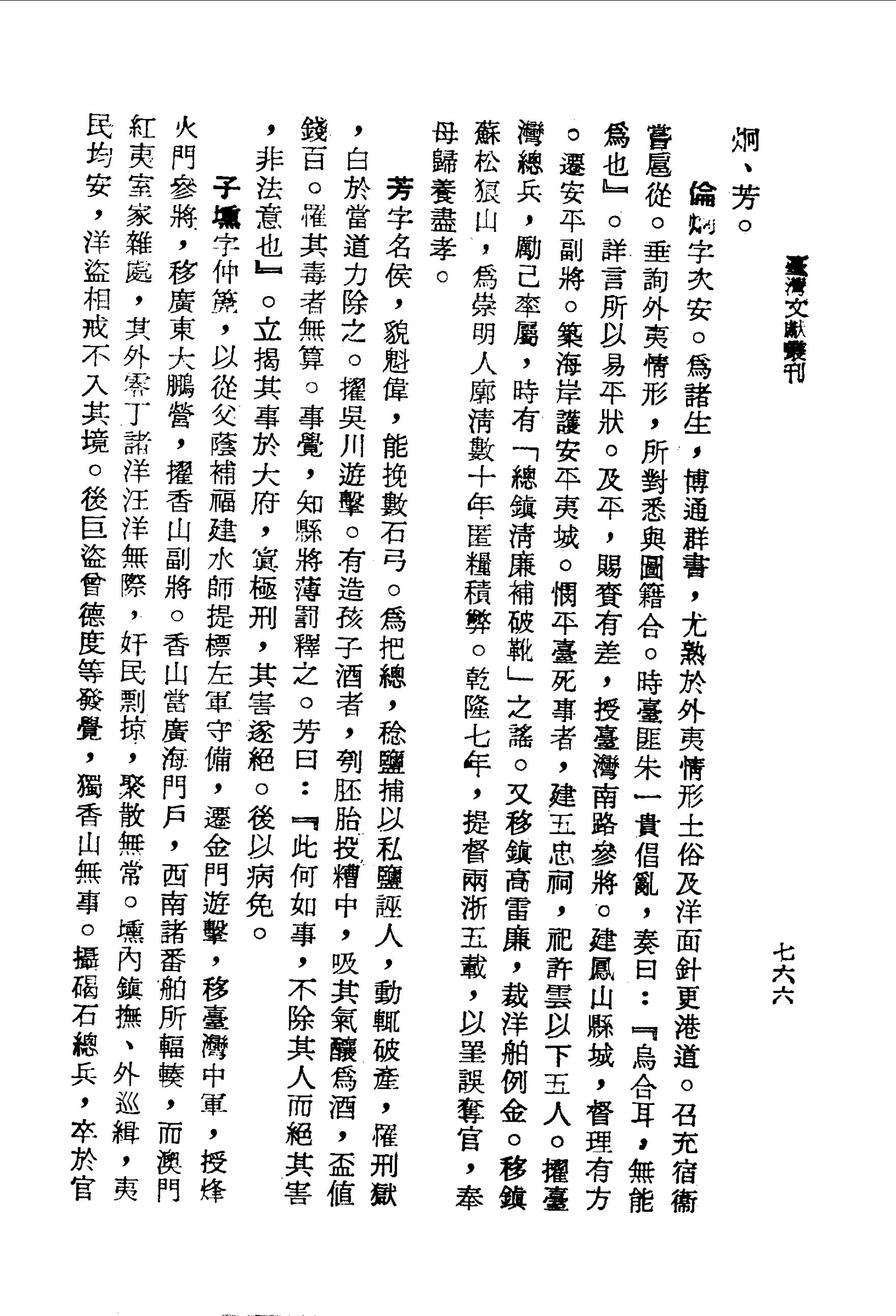 芳字名侯,貌魁偉,能挽數石弓。為把總。稔鹽捕以私鹽誣人,動輒破產,罹刑獄,白於當道力除之。擢吳川遊擊。有造孩子酒者,刳胚胎投糟中,吸其氣釀為酒,盃值錢百。罹其毒者無算。事覺,知縣將薄罰釋之。芳曰:『此何如事,不除其人而絕其害,非法意也』。立揭其事於大府,寘極刑,其害遂絕。後以病免。