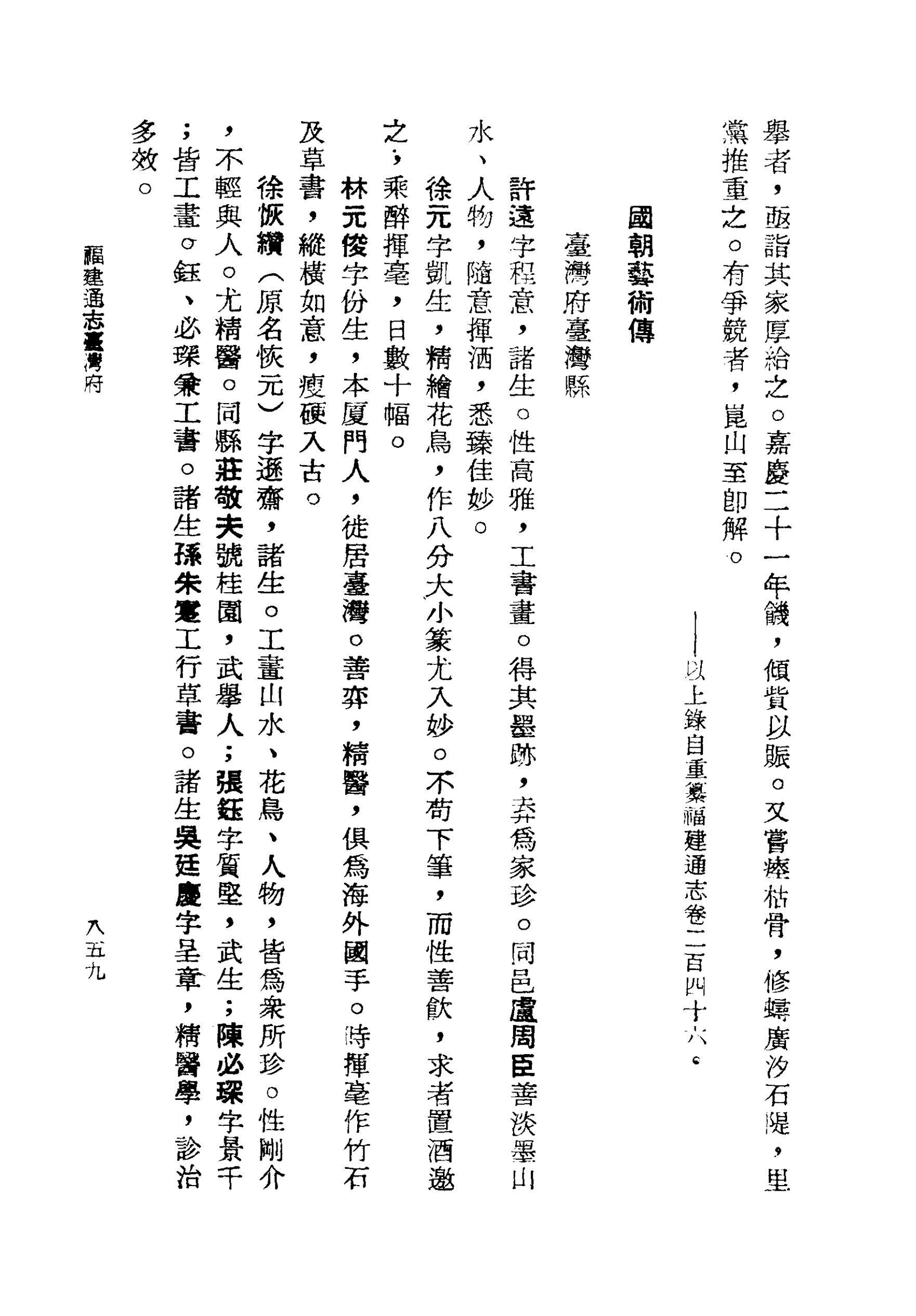 林元俊字份生,本廈門人,徙居臺灣.善弈,精醫,俱為海外國手.時揮毫作竹石及草書,縱橫如意,瘦硬入古。