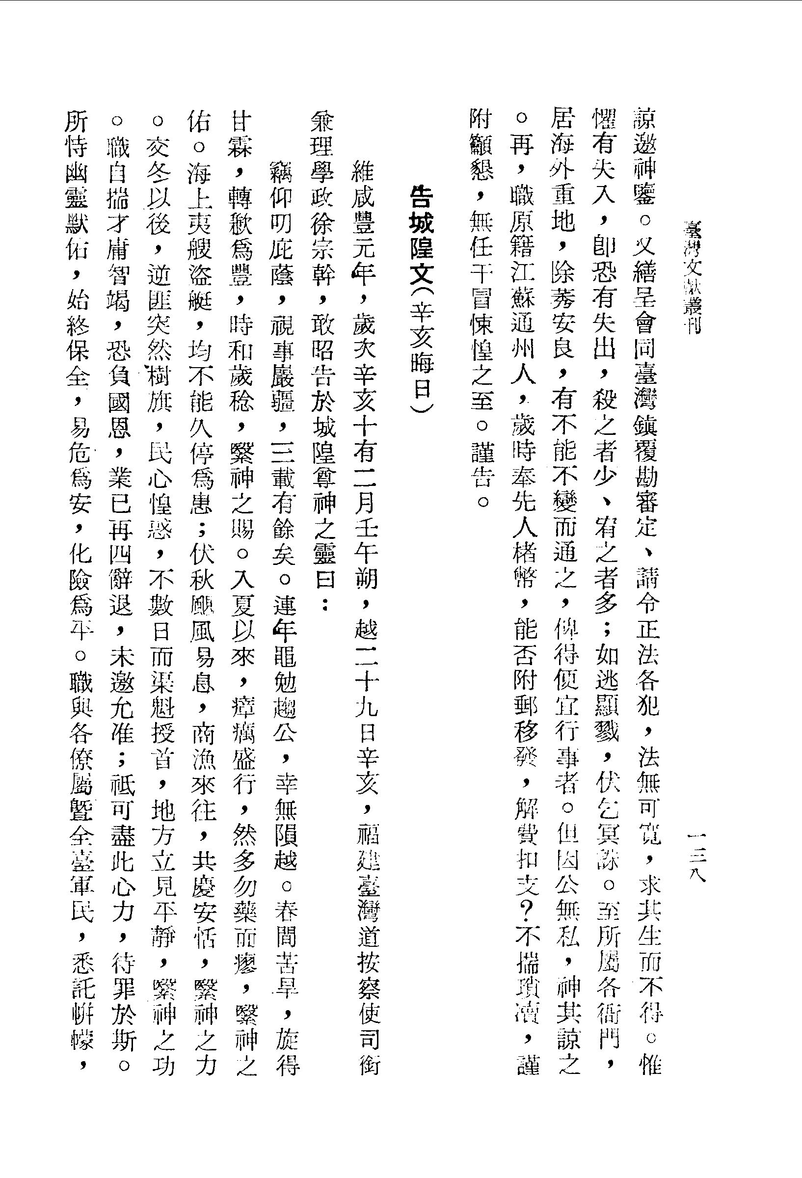 春間苦旱,旋得甘霖,轉歉為豐,時和歲稔,繄神之賜。入夏以來,瘴癘盛行,然多勿藥而瘳,繄神之佑。海上夷艘盜艇,均不能久停為患;伏秋颶風易息,商漁來往,共慶安恬,繄神之力。