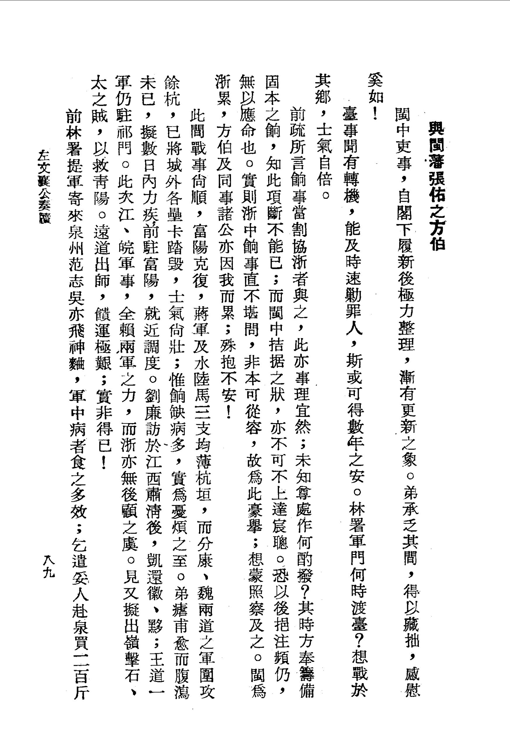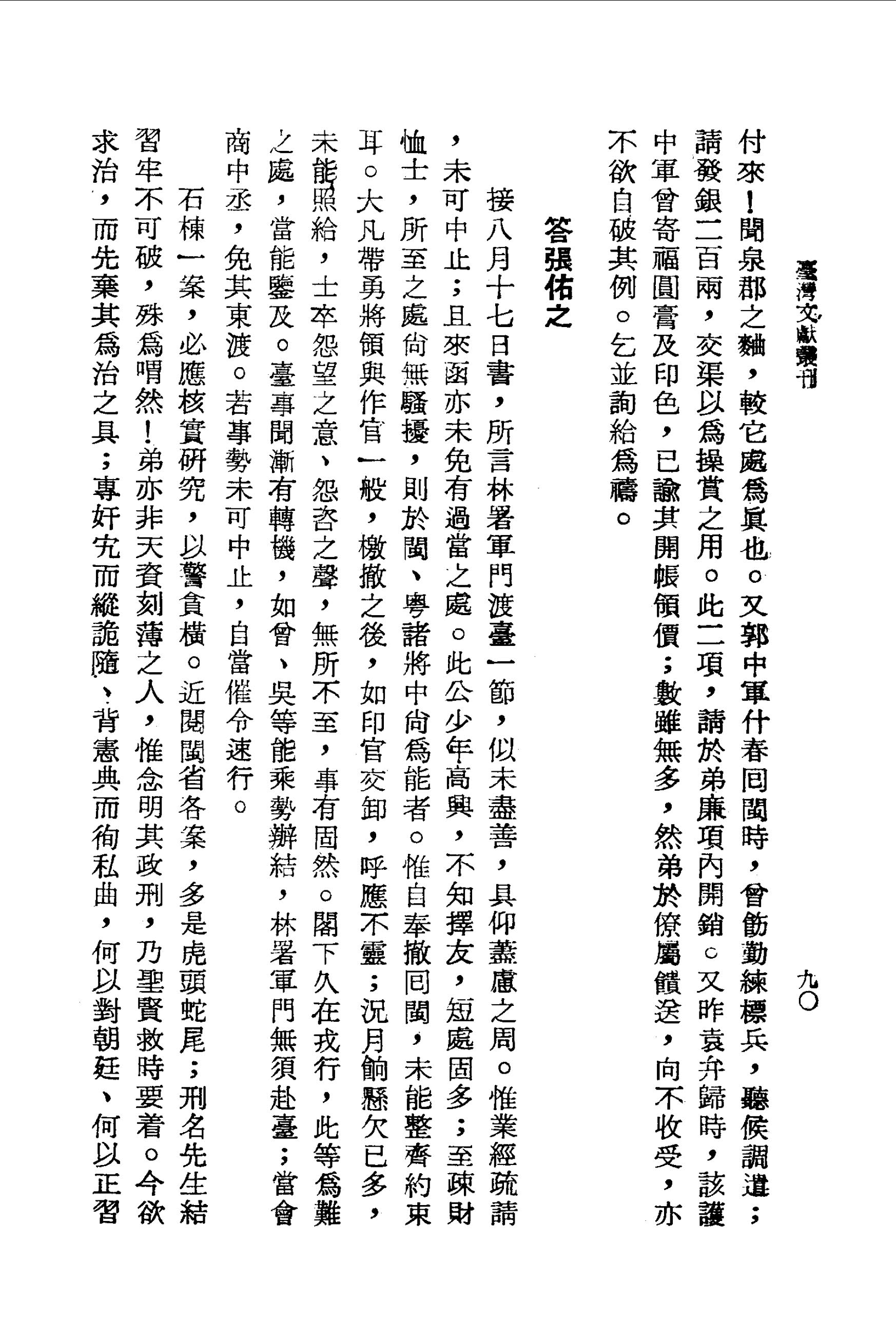 前林署提軍寄來泉州范志吳亦飛神麯,軍中病者食之多效;乞遣妥人赴泉買二百斤付來!聞泉郡之麯,較它處為真也。又郭中軍什春回閩時,曾飭勤練標兵,聽候調遣;請發銀二百兩,交渠以為操賞之用。此二項,請於弟廉項內開銷。又昨袁弁歸時,該護中軍曾寄福圓膏及印色,已諭其開帳領價;數雖無多,然弟於僚屬饋送,向不收受,亦不欲自破其例。乞並詢給為禱。
