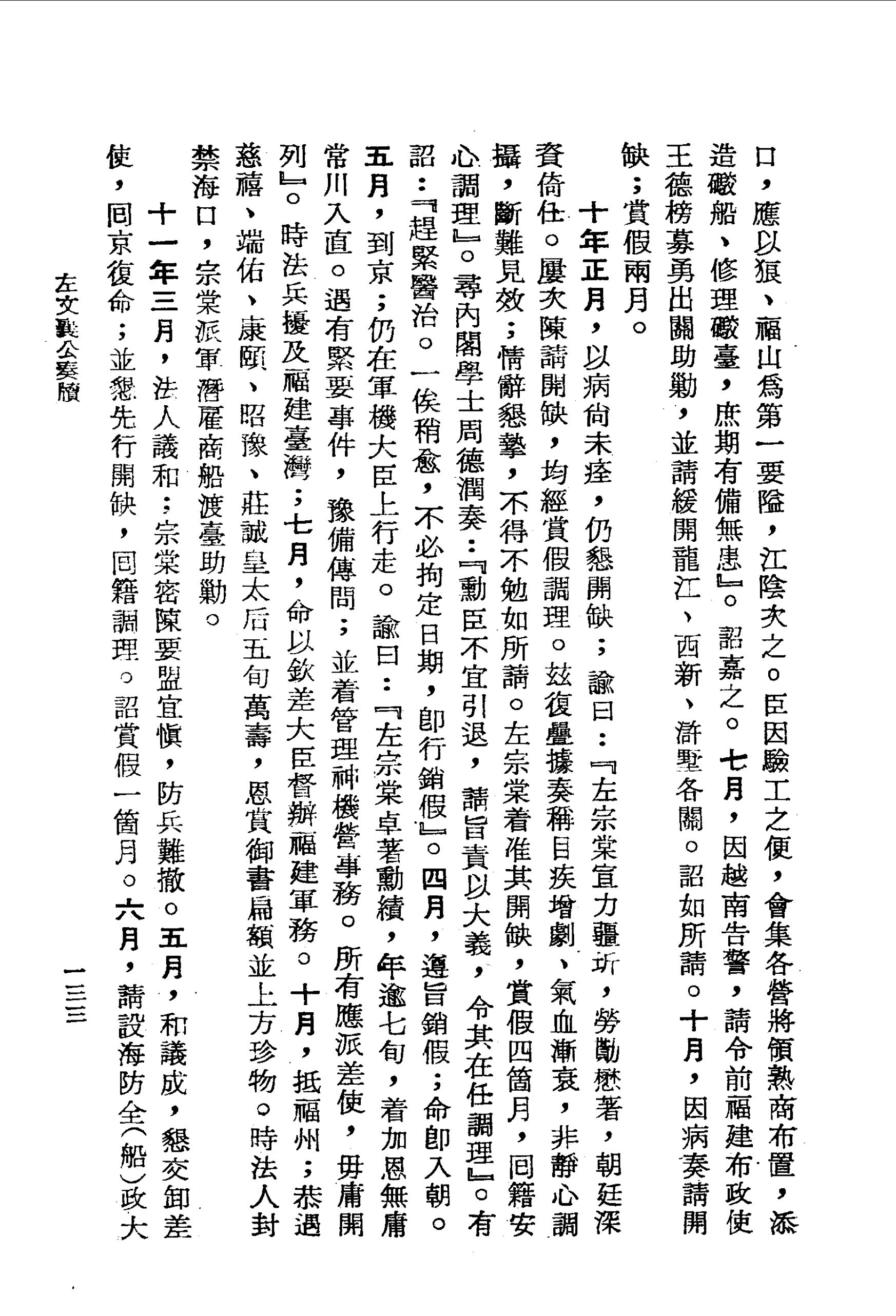 十年正月,以病尚未痊,仍懇開缺;諭曰:『左宗棠宣力疆圻,勞勩懋著,朝廷深資倚任。屢次陳請開缺,均經賞假調理。茲復疊據奏稱目疾增劇、氣血漸衰,非靜心調攝,斷難見效;情辭懇摯,不得不勉如所請。左宗棠著准其開缺,賞假四個月,回籍安心調理』。尋內閣學士周德潤奏:『勳臣不宜引退,請旨責以大義,令其在任調理』。有詔:『趕緊醫治。一俟稍愈,不必拘定日期,即行銷假』。四月,遵旨銷假;命即入朝。