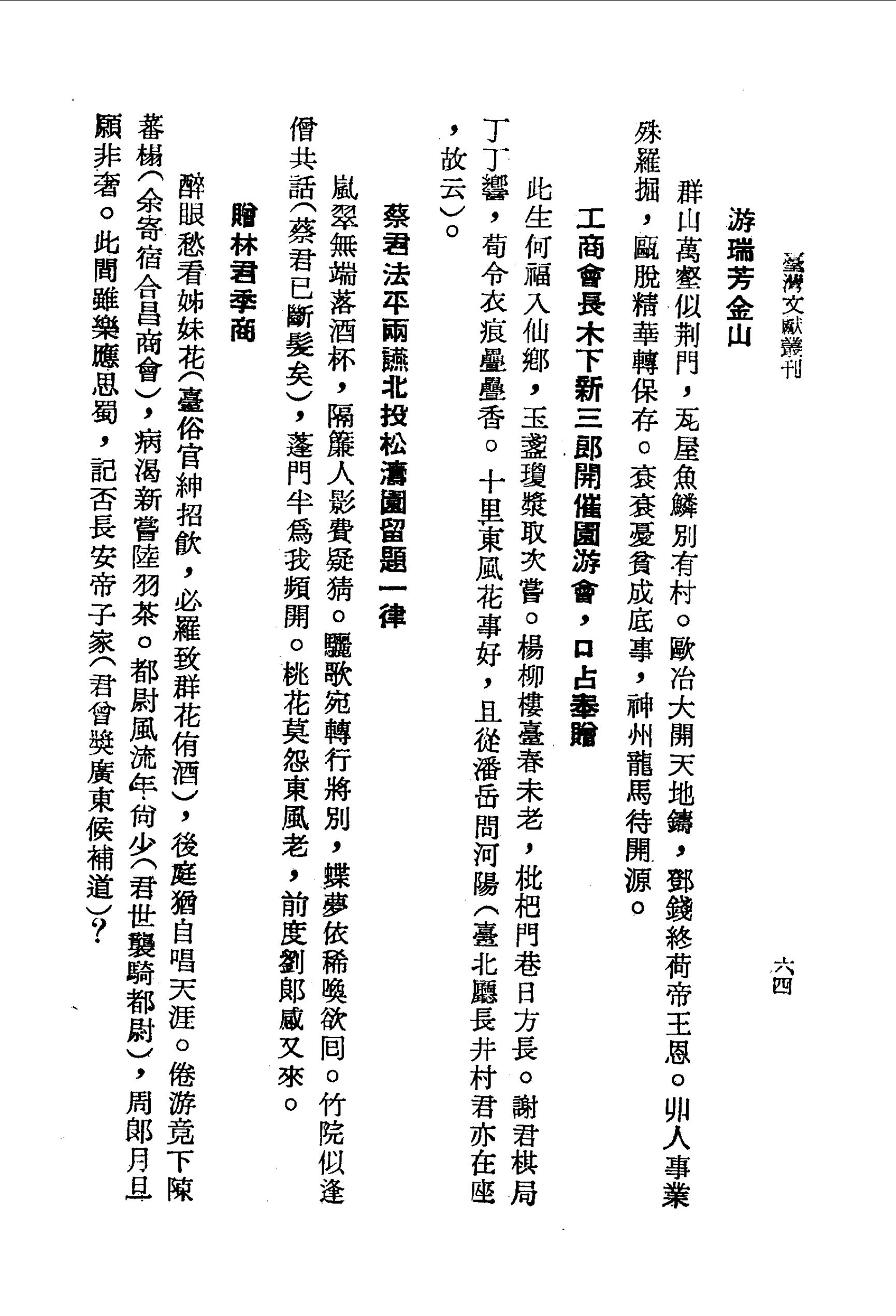 醉眼愁看姊妹花(臺俗官紳招飲,必羅致群花侑酒),後庭猶自唱天涯。倦游竟下陳蕃榻(余寄宿合昌商會),病渴新嘗陸羽茶。都尉風流年尚少(君世襲騎都尉),周郎月旦願非奢。此間雖樂應思蜀,記否長安帝子家(君曾獎廣東候補道)?