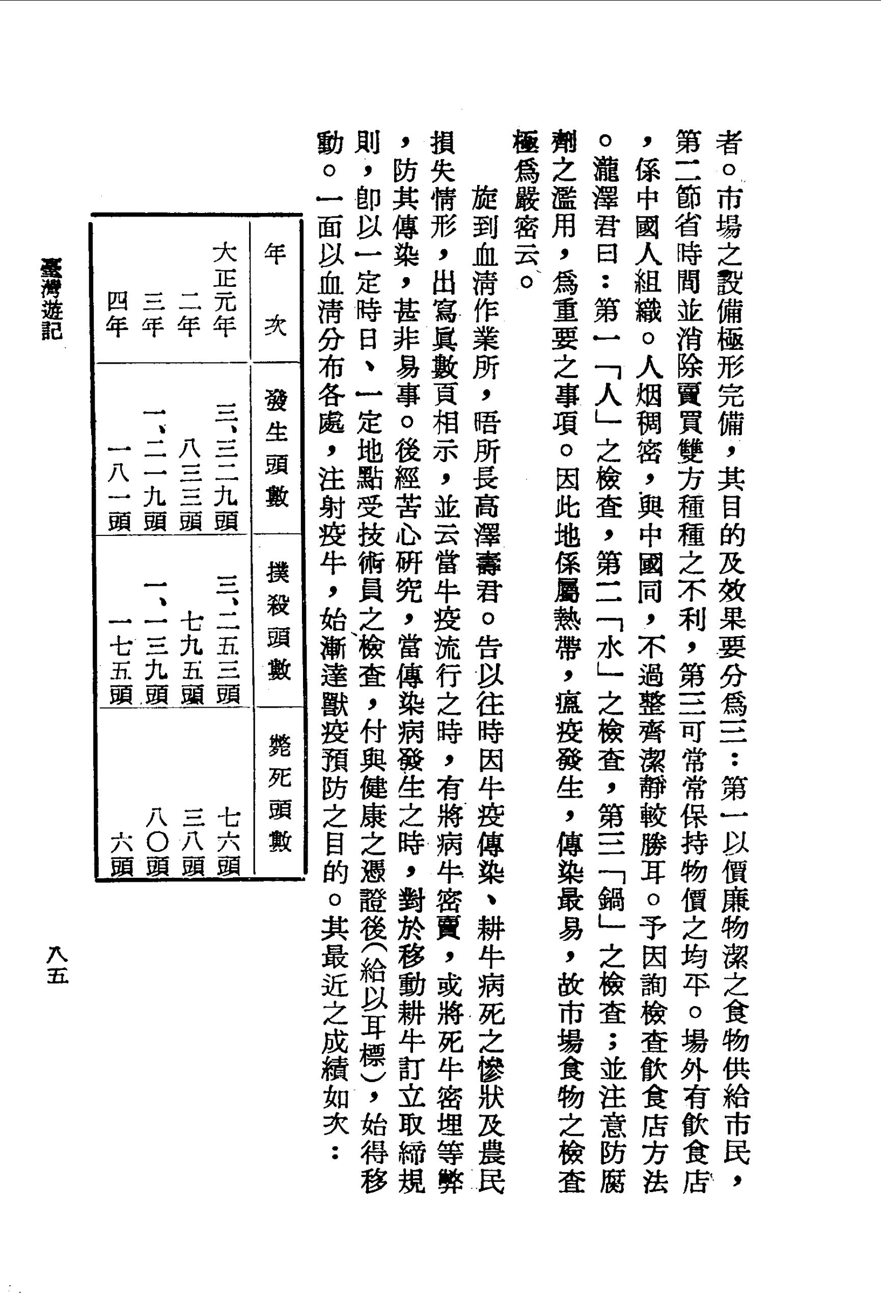 旋到血清作業所,晤所長高澤壽君。告以往時因牛疫傳染、耕牛病死之慘狀及農民損失情形,出寫真數頁相示,並云當牛疫流行之時,有將病牛密賣,或將死牛密埋等弊,防其傳染,甚非易事。後經苦心研究,當傳染病發生之時,對於移動耕牛訂立取締規則,即以一定時日、一定地點受技術員之檢查,付與健康之憑證後(給以耳標),始得移動。一面以血清分布各處,注射疫牛,始漸達獸疫預防之目的。