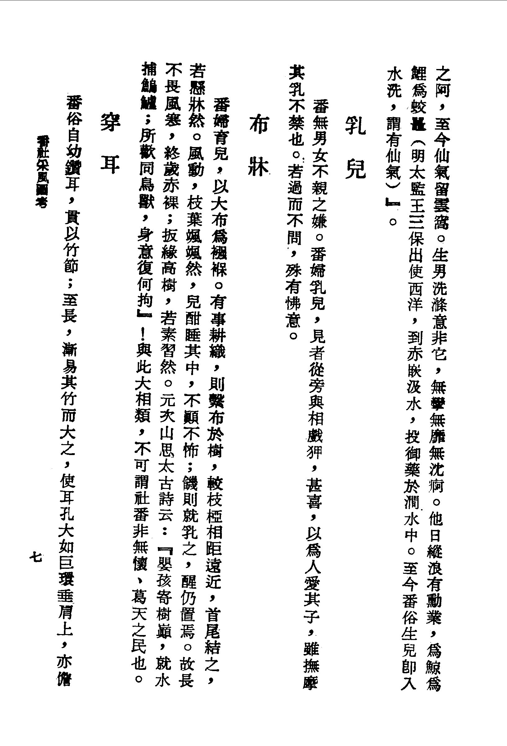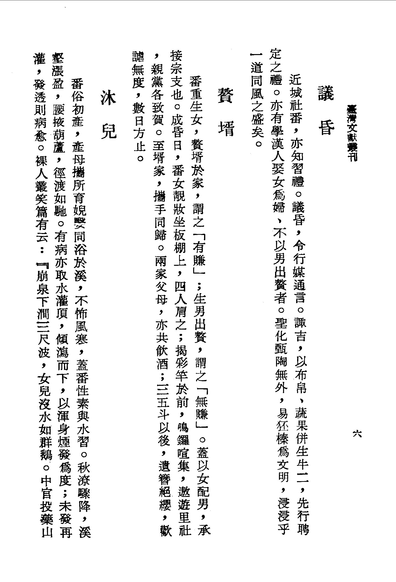 番俗初產,產母攜所育婗嫛同浴於溪,不怖風寒,蓋番性素與水習。秋潦驟降,溪壑漲盈,腰掖葫蘆,徑渡如馳。有病亦取水灌頂,傾瀉而下,以渾身煙發為度;未發再灌,發透則病愈。裸人叢笑篇有云:『崩泉下澗三尺波,女兒沒水如群鵝。中官投藥山之阿,至今仙氣留雲窩。生男洗滌意非它,無攣無靡無沈痾。他日縱浪有勳業,為鯨為鯉為蛟鼉(明太監王三保出使西洋,到赤崁汲水,投御藥於澗水中。至今番俗生兒即入水洗,謂有仙氣)』。