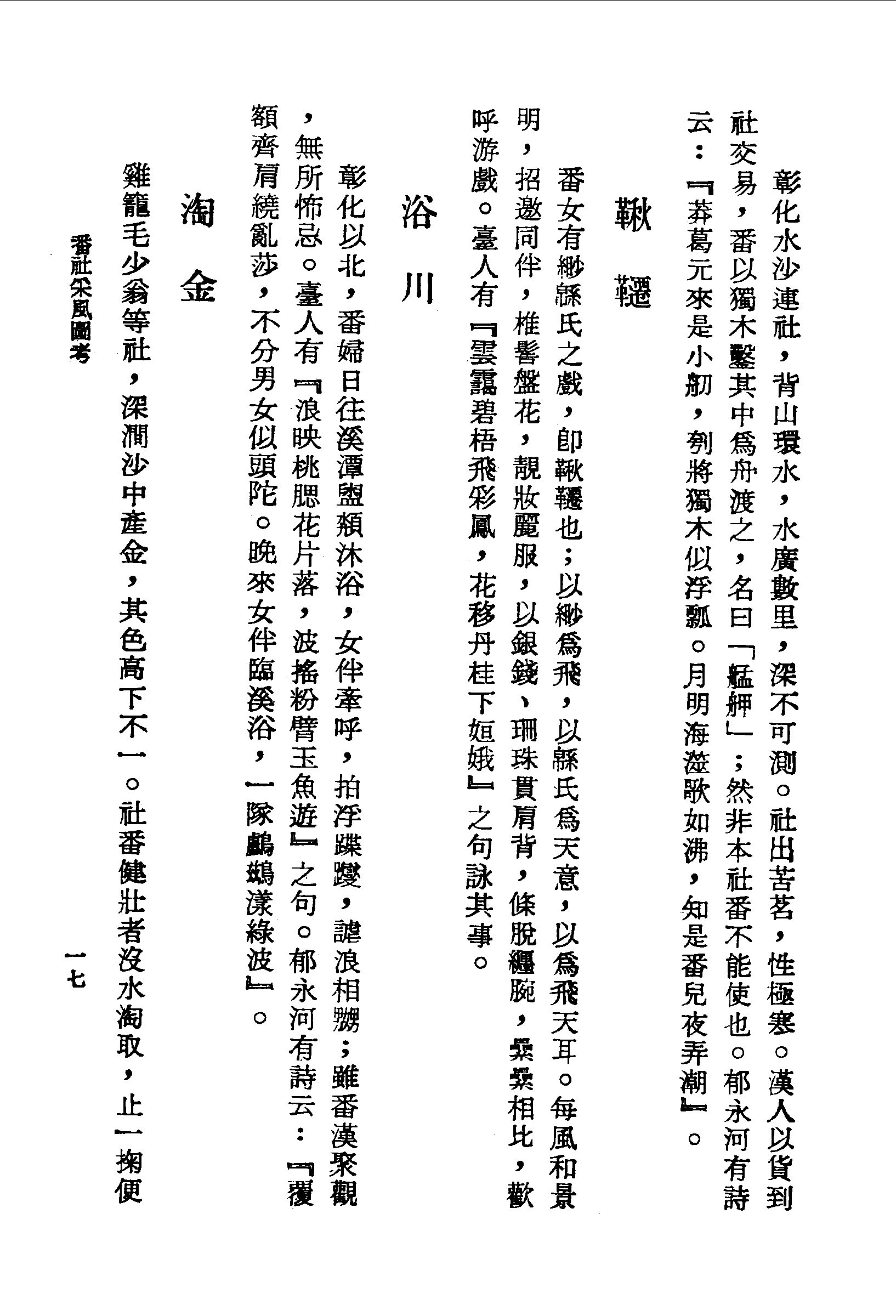 彰化水沙連社,背山環水,水廣數里,深不可測。社出苦茗,性極寒。漢人以貨到社交易,番以獨木鑿其中為舟渡之,名曰「艋舺」;然非本社番不能使也。郁永河有詩云:『莽葛元來是小舠,刳將獨木似浮瓢。月明海澨歌如沸,知是番兒夜弄潮』。