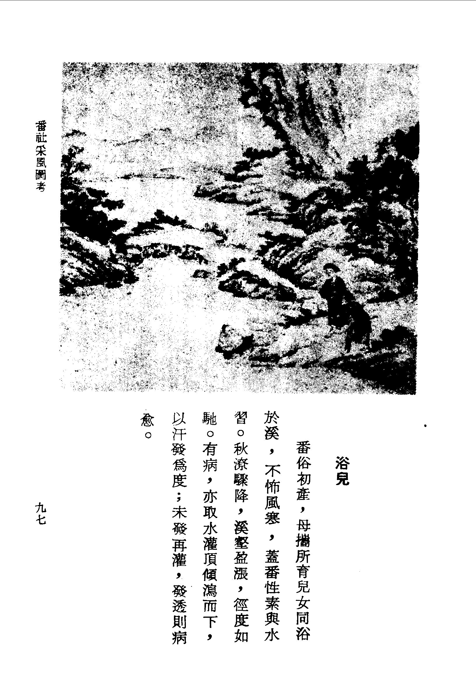 番俗初產,母攜所育兒女同浴於溪,不怖風寒,蓋番性素與水習。秋潦驟降,溪壑盈漲,徑度如馳。有病,亦取水灌頂傾瀉而下,以汗發為度;未發再灌,發透則病愈。
