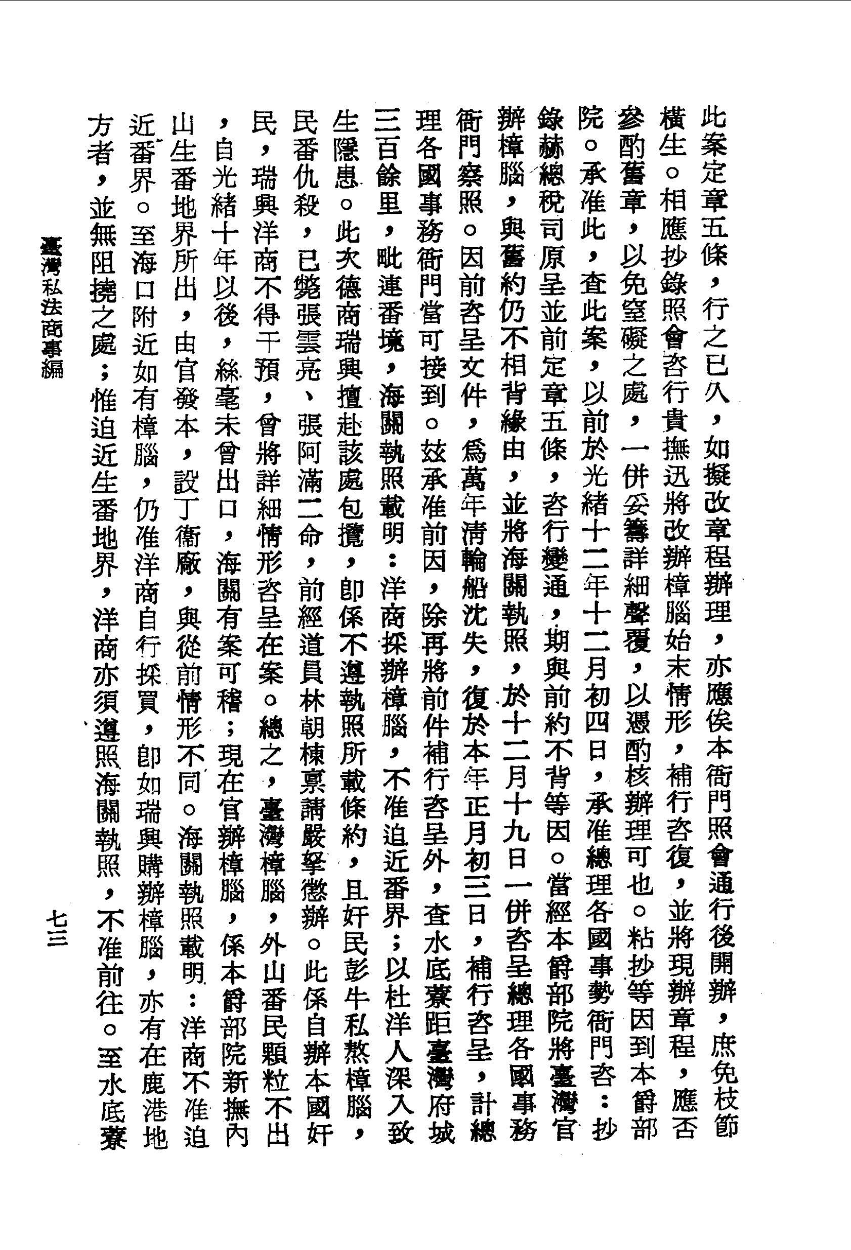 總之,臺灣樟腦,外山番民顆粒不出,自光緒十年以後,絲毫未曾出口,海關有案可稽;現在官辦樟腦,係本爵部院新撫內山生番地界所出,由官發本,設丁衛廠,與從前情形不同。海關執照載明:洋商不准迫近番界。至海口附近如有樟腦,仍准洋商自行採買,即如瑞興購辦樟腦,亦有在鹿港地方者,並無阻撓之處;惟迫近生番地界,洋商亦須遵照海關執照,不准前往。
