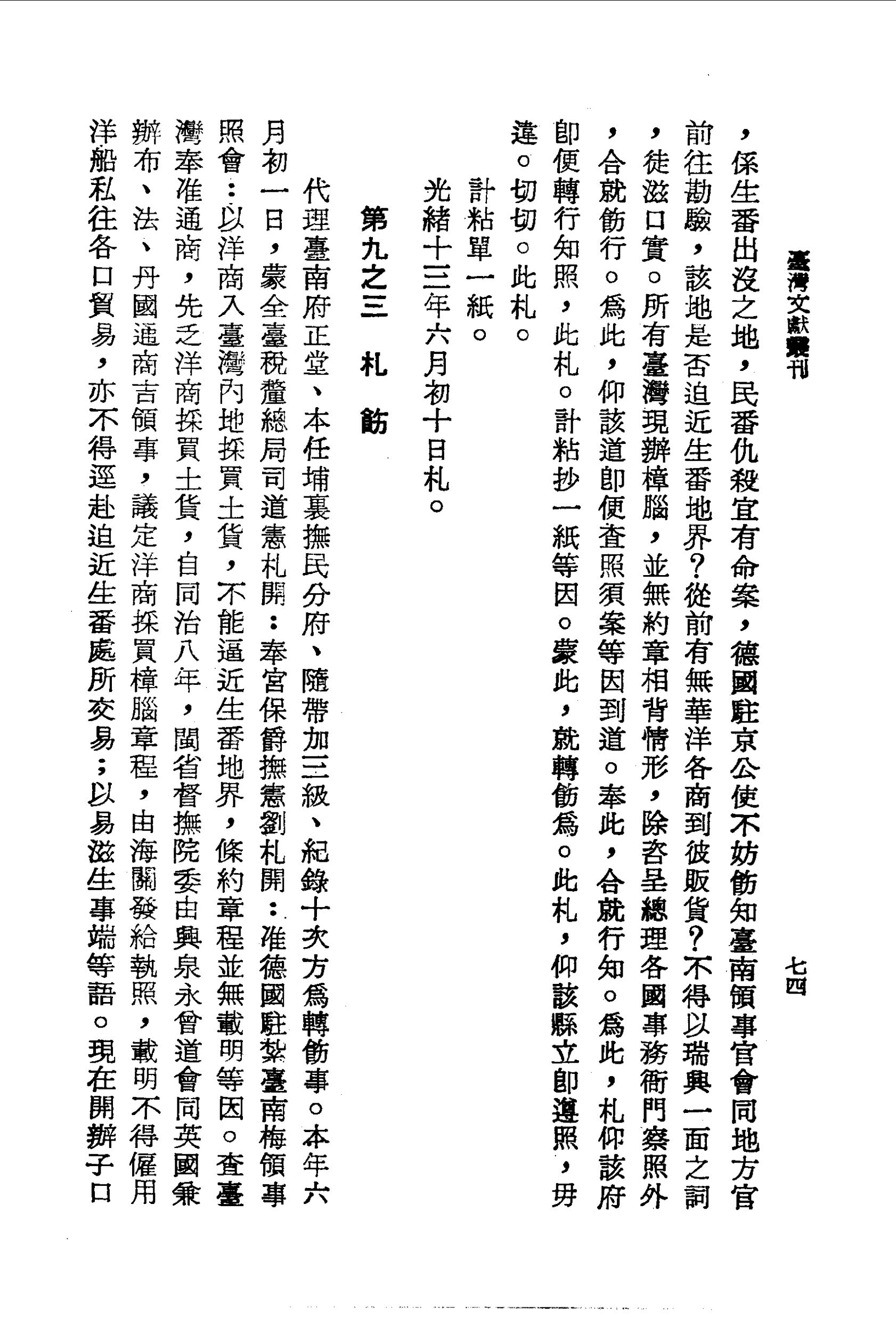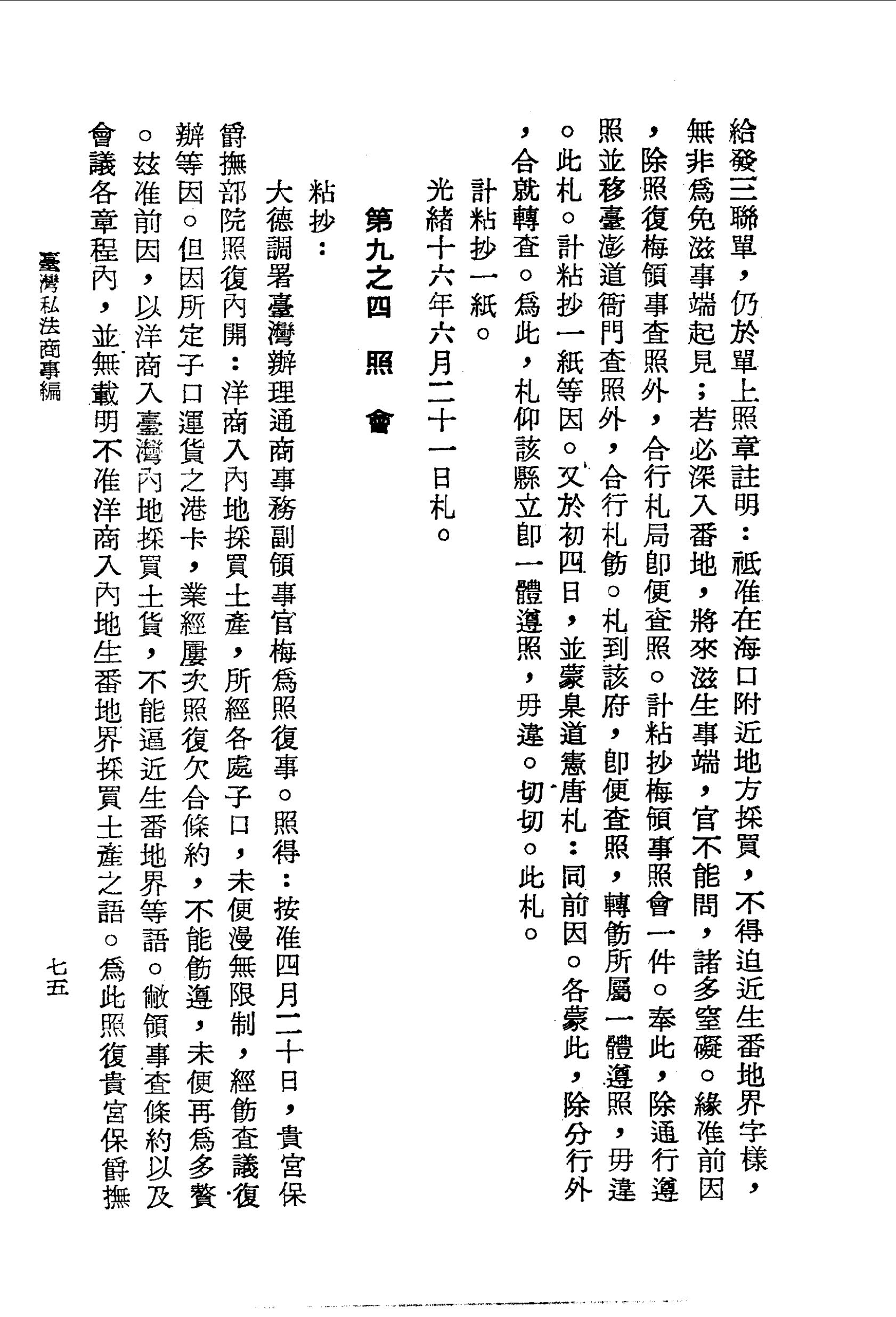 查臺灣奉准通商,先乏洋商採買土貨,自同治八年,閩省督撫院委由興泉永曾道會同英國兼辦布、法、丹國通商吉領事,議定洋商採買樟腦章程,由海關發給執照,載明不得僱用洋船私往各口貿易,亦不得逕赴迫近生番處所交易;以易滋生事端等語。現在開辦子口給發三聯單,仍於單上照章註明:祗准在海口附近地方採買,不得迫近生番地界字樣,無非為免滋事端起見;若必深入番地,將來滋生事端,官不能問,諸多窒礙。
