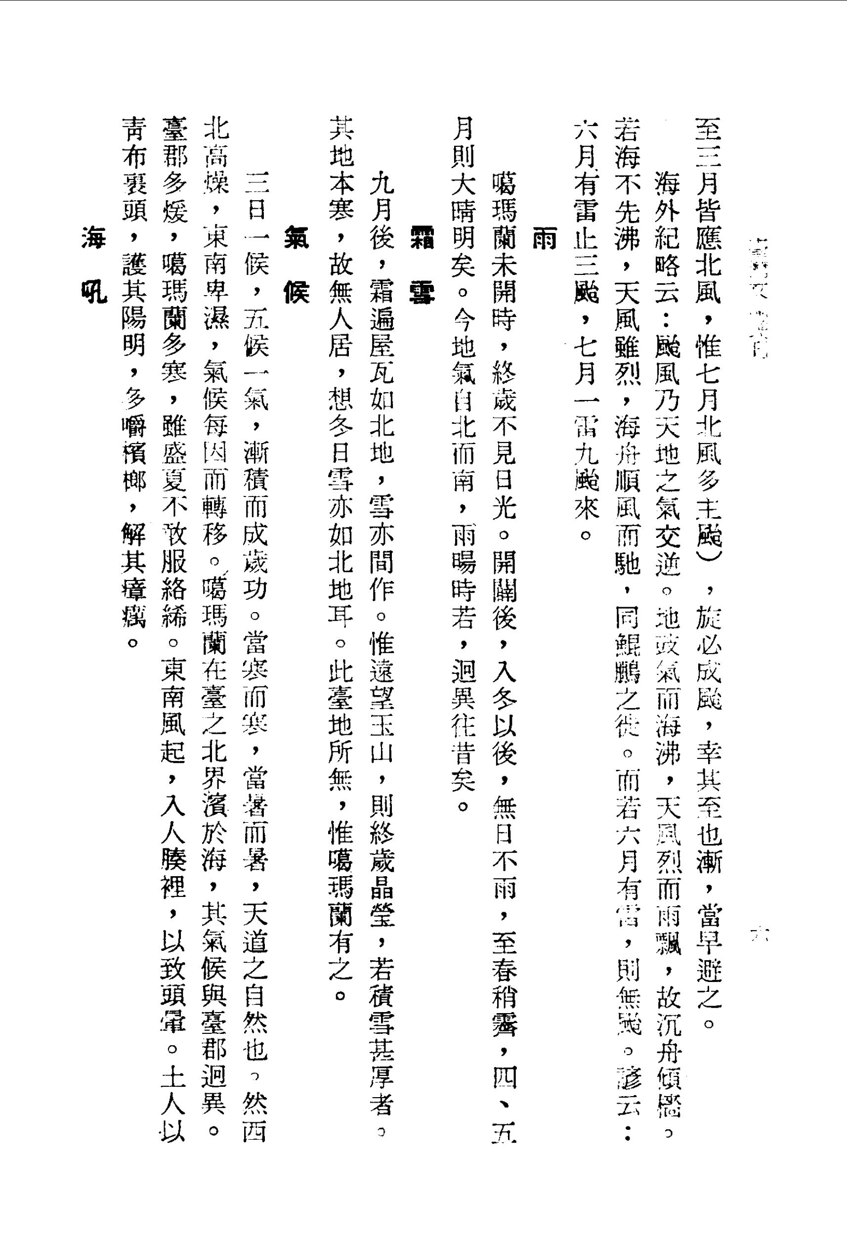三日一候,五候一氣,漸積而成歲功。當寒而寒,當暑而暑,天道之自然也。然西北高燥,東南卑濕,氣候每因而轉移。噶瑪蘭在臺之北界濱於海,其氣候與臺郡迥異。臺郡多煖,噶瑪蘭多寒,雖盛夏不敢服絡絺。東南風起,入人腠裡,以致頭暈。土人以青布裹頭,護其陽明,多嚼檳榔,解其瘴癘。