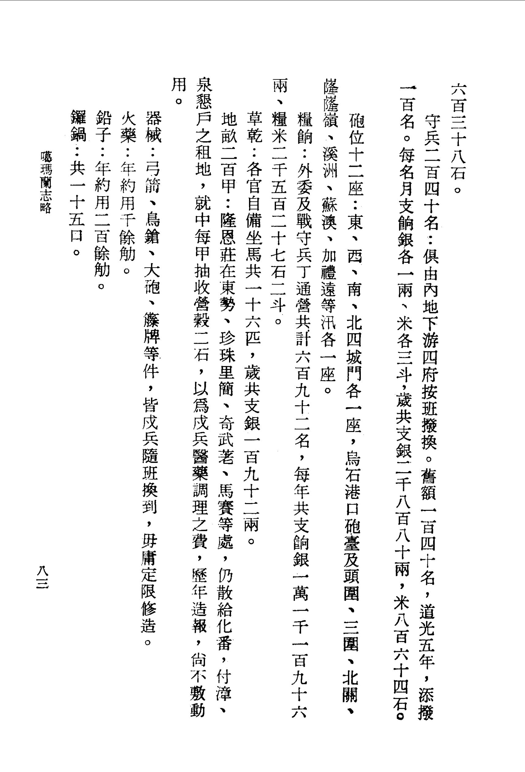 地畝二百甲:隆恩莊在東勢、珍珠里簡、奇武荖、馬賽等處,仍散給化番,付漳、泉墾戶之租地,就中每甲抽收營穀二石,以為戍兵醫藥調理之費,歷年造報,尚不敷動用。