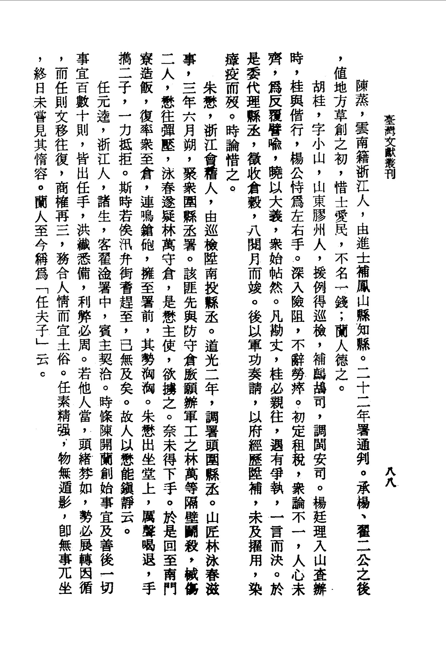 胡桂,字小山,山東膠州人,援例得巡檢,補鷓鴣司,調閩安司。楊廷理入山查辦時,桂與偕行,楊公恃為左右手。深入險阻,不辭勞瘁。初定租稅,眾論不一,人心未齊,為反覆譬喻,曉以大義,眾始帖然。凡勘丈,桂必親往,遇有爭執,一言而決。於是委代理縣丞,徵收倉穀,八閱月而竣。後以軍功奏請,以府經歷陞補,未及擢用,染瘴疫而歿。時論惜之。