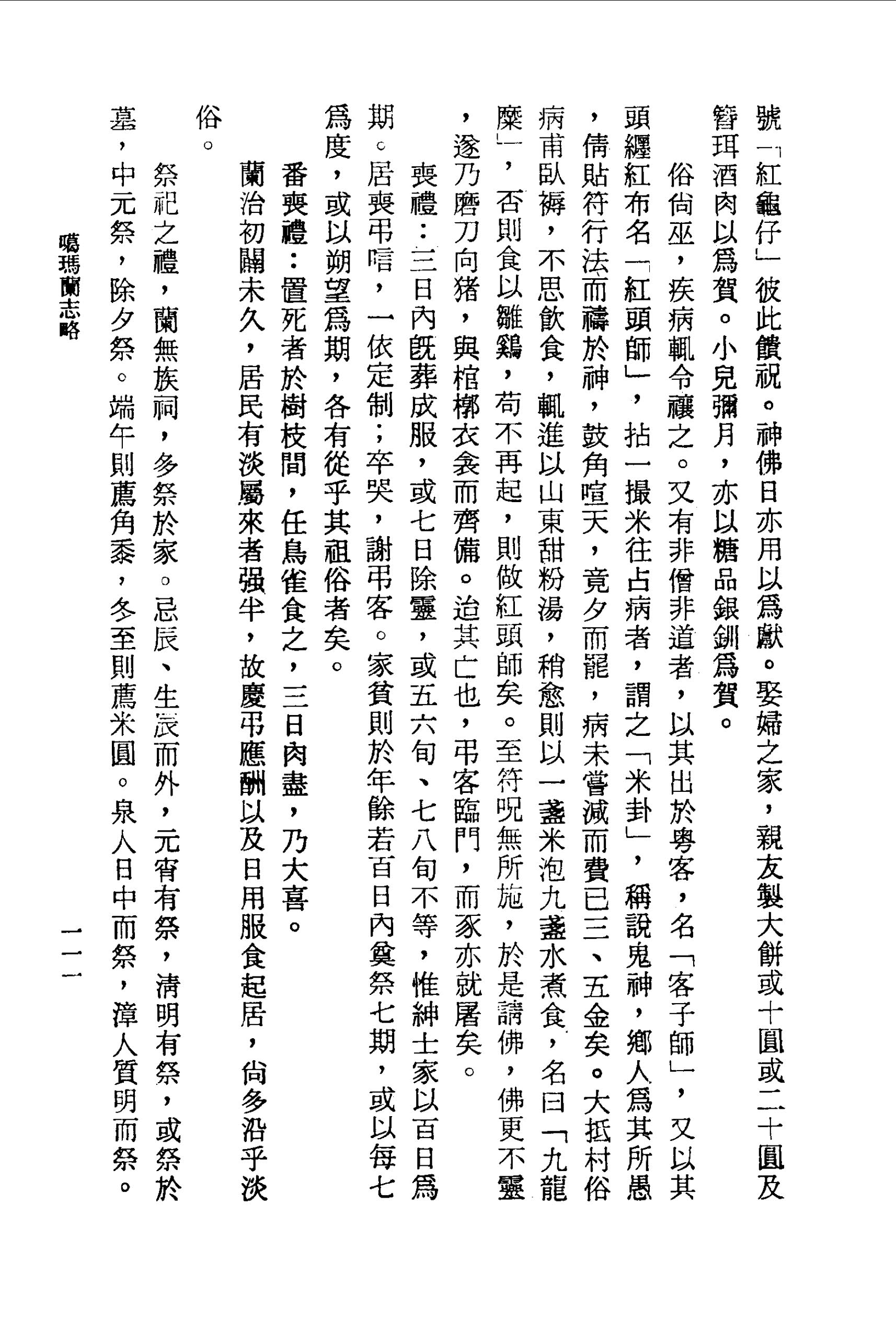 俗尚巫,疾病輒令禳之。又有非僧非道者,以其出於粵客,名「客子師」,又以其頭纏紅布名「紅頭師」,拈一撮米往占病者,謂之「米卦」,稱說鬼神,鄉人為其所愚,倩貼符行法而禱於神,鼓角喧天,竟夕而罷,病未嘗減而費已三、五金矣。大抵村俗病甫臥褥,不思飲食,輒進以山東甜粉湯,稍愈則以一盞米泡九盞水煮食,名曰「九龍糜」,否則食以雛雞,苟不再起,則做紅頭師矣。至符咒無所施,於是請佛,佛更不靈,遂乃磨刀向豬,與棺槨衣衾而齊備。迨其亡也,弔客臨門,而豕亦就屠矣。