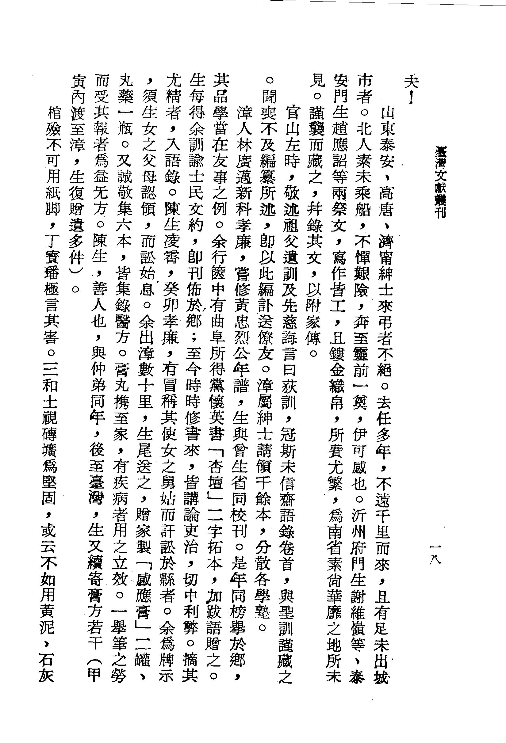 余出漳數十里,生尾送之,贈家製「感應膏」二罐、丸藥一瓶。又誠敬集六本,皆集錄醫方。膏丸攜至家,有疾病者用之立效。一舉筆之勞而受其報者為益無方。陳生,善人也,與仲弟同年,後至臺灣,生又續寄膏方若干(甲寅內渡至漳,生復贈遺多件)。