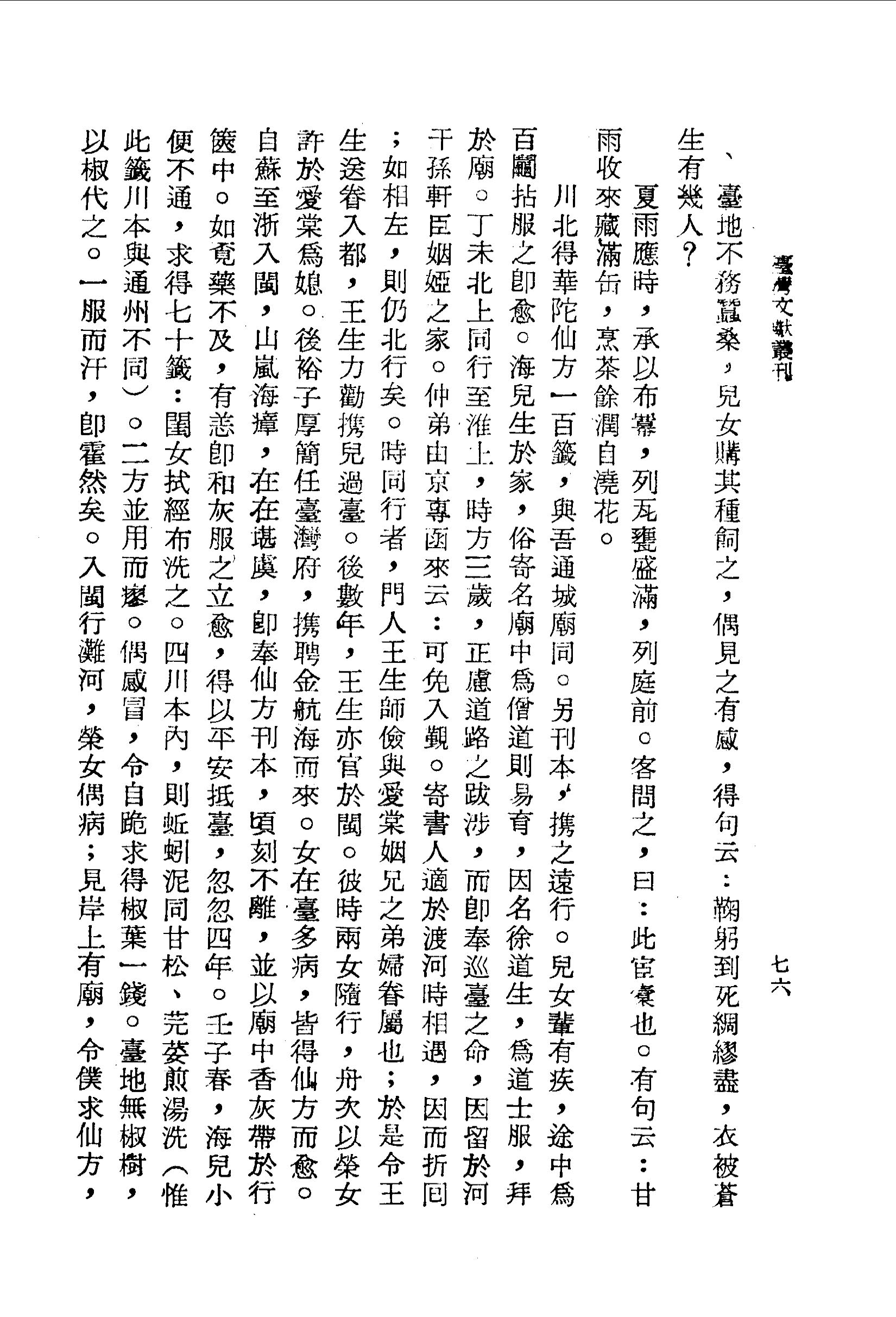 川北得華陀仙方一百籤,與吾通城廟同。另刊本,攜之遠行。兒女輩有疾,途中為百鬥拈服之即愈。海兒生於家,俗寄名廟中為僧道則易育,因名徐道生,為道士服,拜於廟。