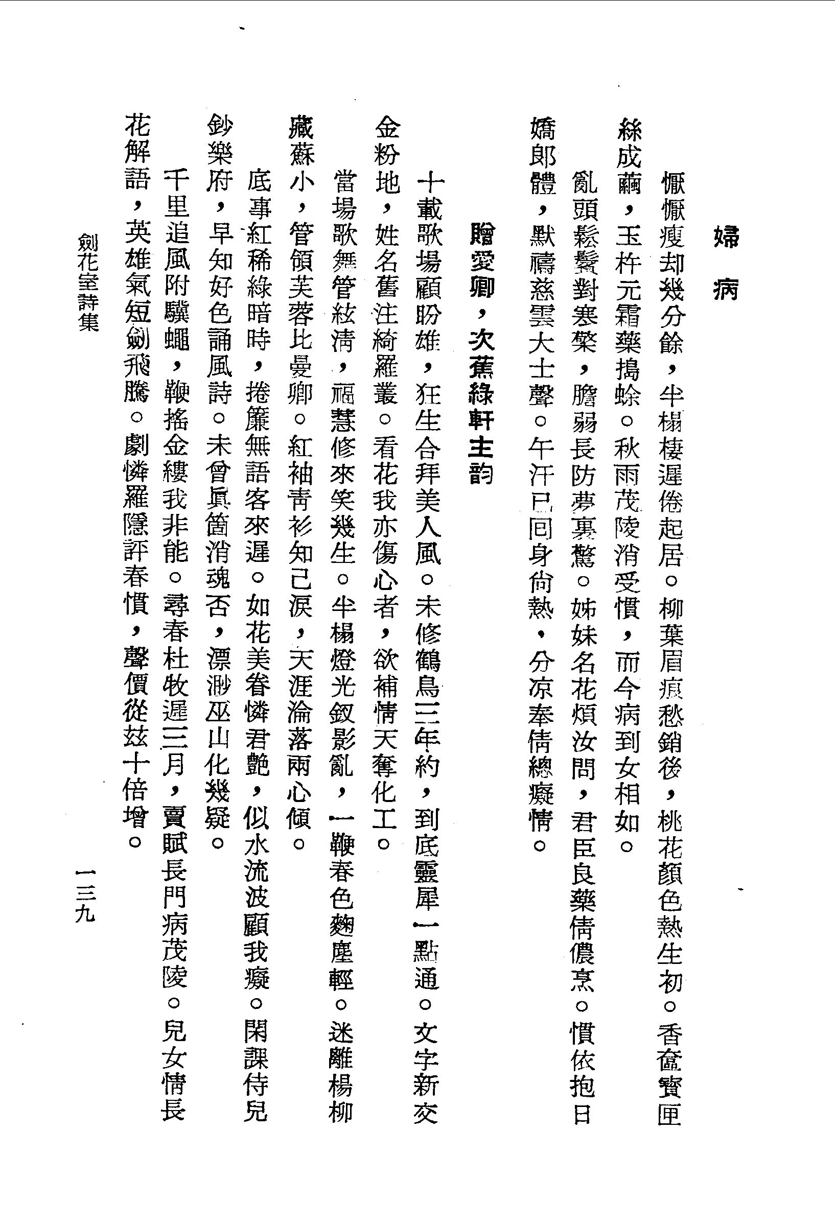 亂頭鬆鬢對寒檠,膽弱長防夢裏驚。姊妹名花煩汝問,君臣良藥倩儂烹。慣依抱日嬌郎體,默禱慈雲大士聲。午汗已回身尚熱,分涼奉倩總癡情。
