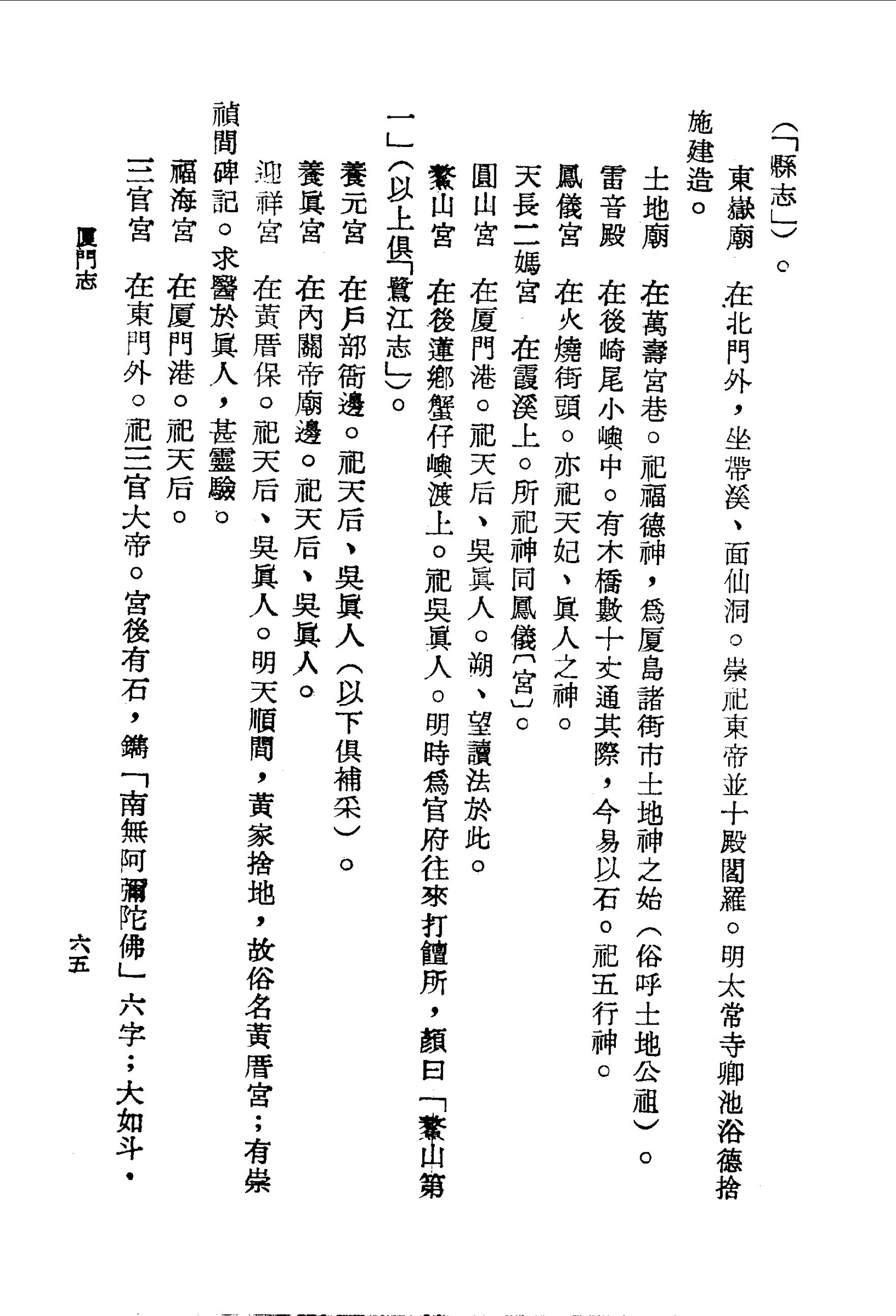 迎祥宮 在黃厝保。祀天后、吳真人。明天順間,黃家捨地,故俗名黃厝宮;有崇禎間碑記,求醫於真人,甚靈驗。