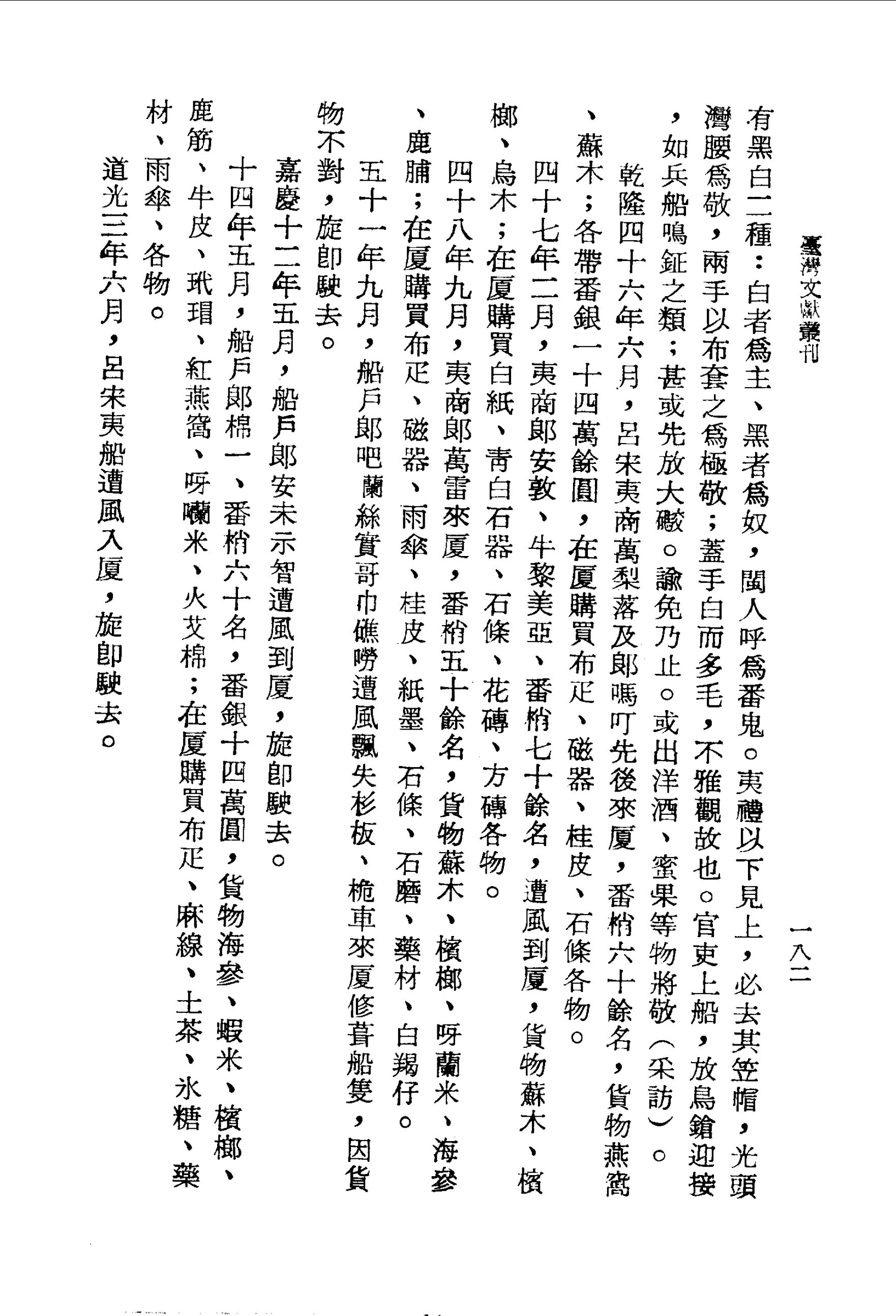 十四年五月.船戶郎棉一、番梢六十名,番銀十四萬圓,貨物海參、蝦米、檳榔、鹿筋、牛皮、玳瑁、紅燕窩、呀囒米、火艾棉;在廈購買布疋、麻線、土茶、冰糖、藥材、雨傘、各物。