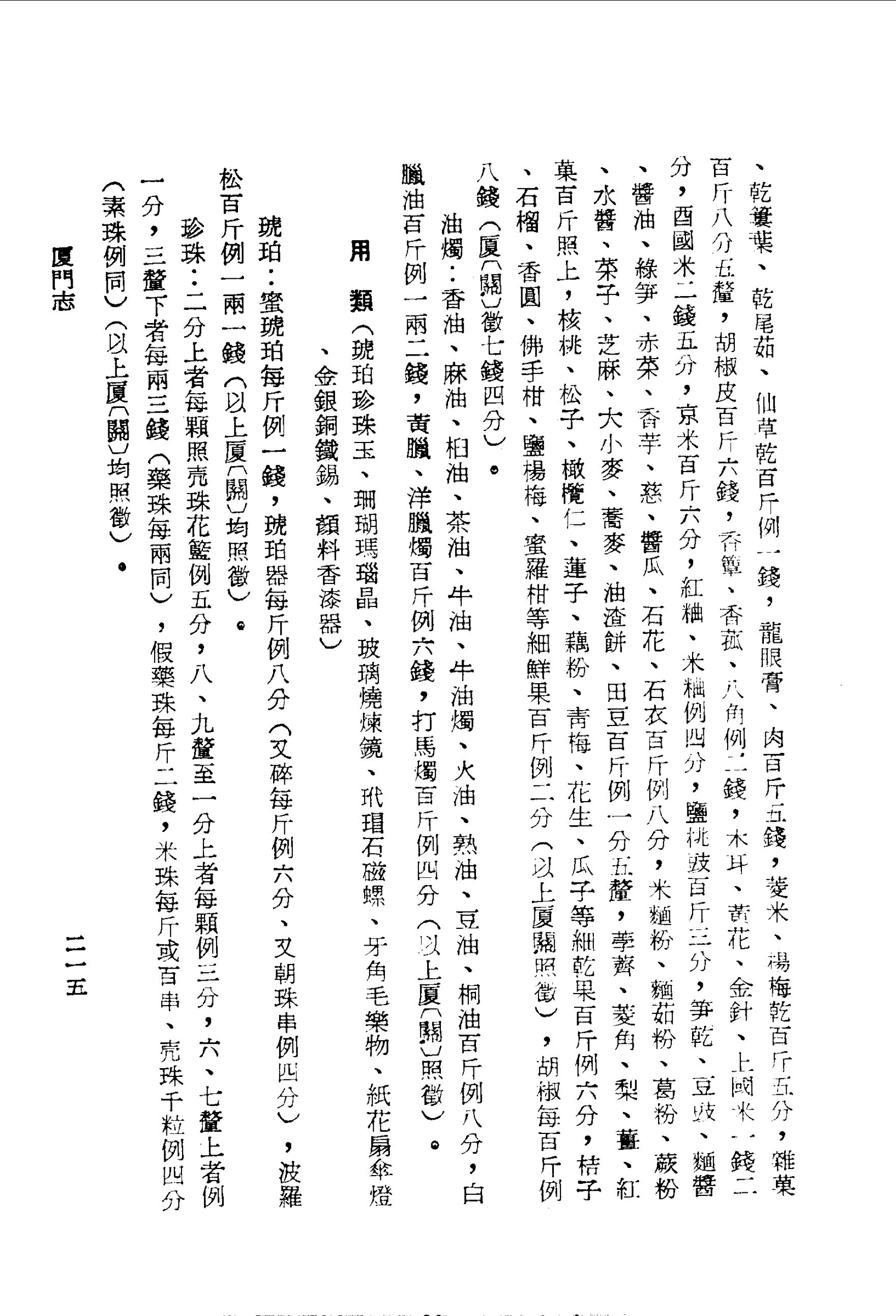 珍珠:二分上者每顆照壳珠花籃例五分,八、九釐至一分上者每顆例三分,六、七釐上者例一分,三釐下者每兩三錢(藥珠每兩同),假藥珠每斤二錢,米珠每斤或百串、壳珠千粒例四分(素珠例同)(以上廈關均照徵)。