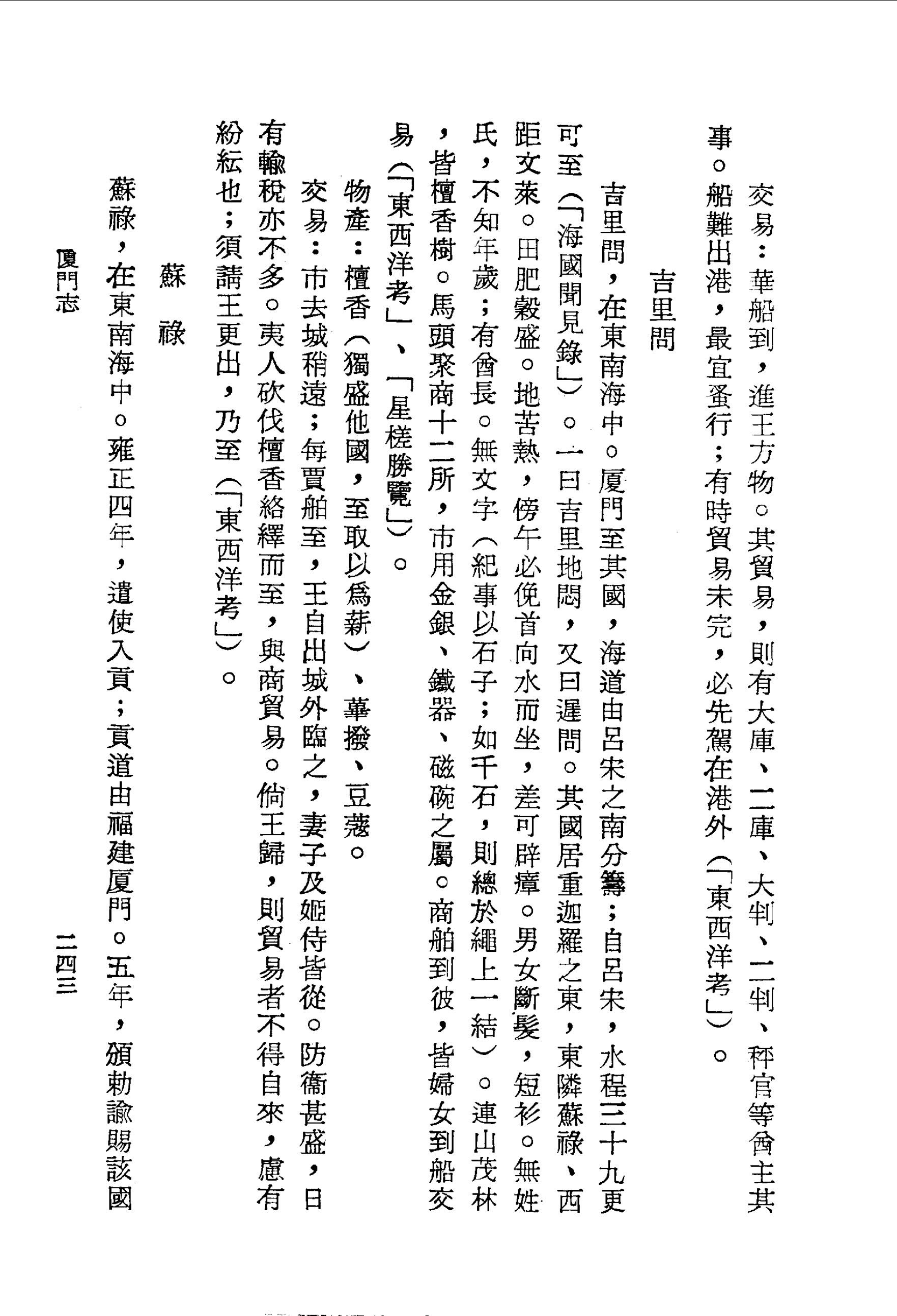 吉里問,在東南海中。廈門至其國,海道由呂宋之南分籌;自呂宋,水程三十九更可至(「海國聞見錄」)。一曰吉里地悶,又曰遲問。其國居重迦羅之東,東鄰蘇祿、西距文萊。田肥穀盛。地苦熱,傍午必俛首向水而坐,差可辟瘴。
