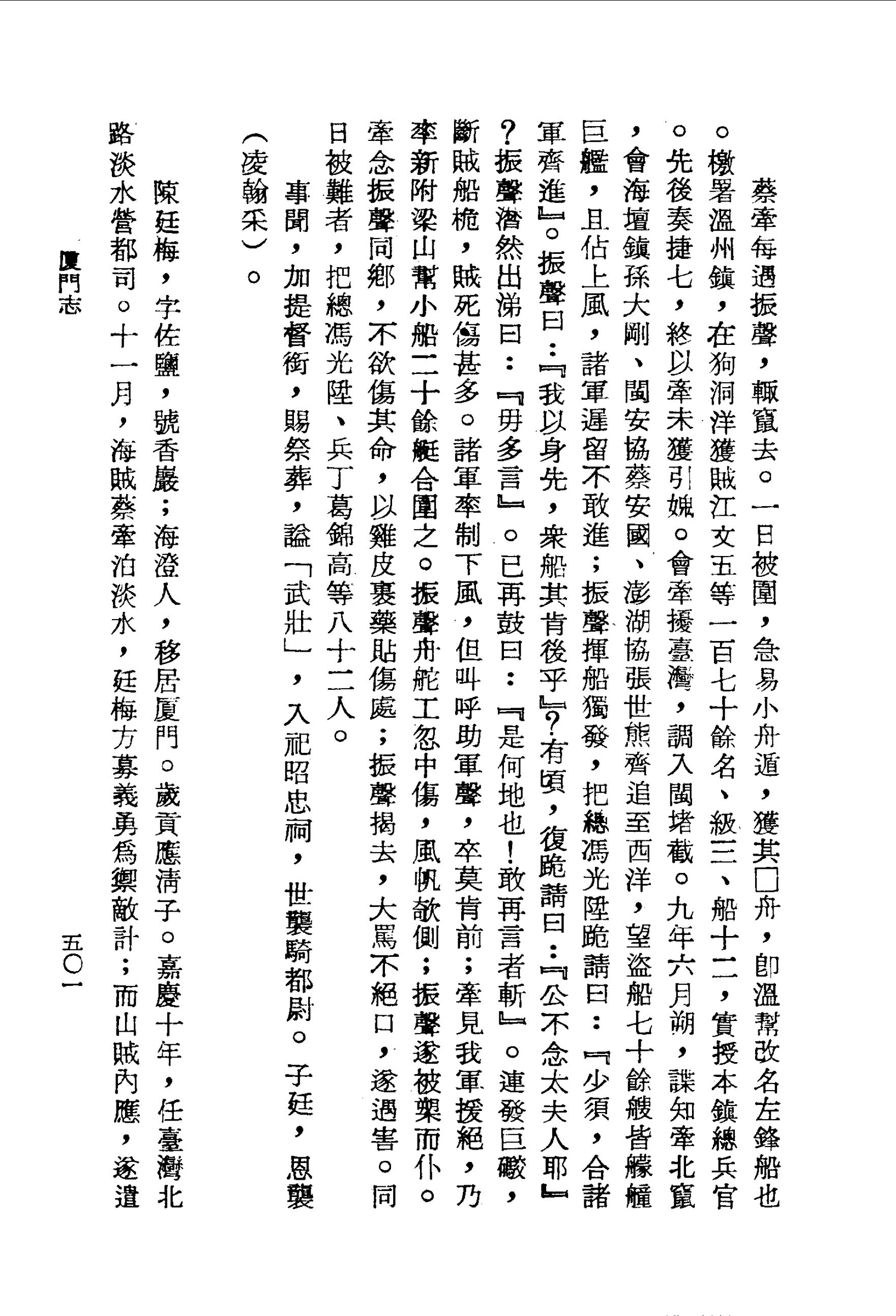 連發巨礮,斷賊船桅,賊死傷甚多。諸軍率制下風,但叫呼助軍聲,卒莫肯前;牽見我軍援絕,乃率新附梁山幫小船二十餘艇合圍之.振聲舟舵工忽中傷,風帆欹側;振聲遂被槊而仆.牽念振聲同鄉,不欲傷其命,以雞皮裹藥貼傷處;振聲揭去,大罵不絕口,遂遇害。同日被難者,把總馮光陞、兵丁葛錦高等八十二人。