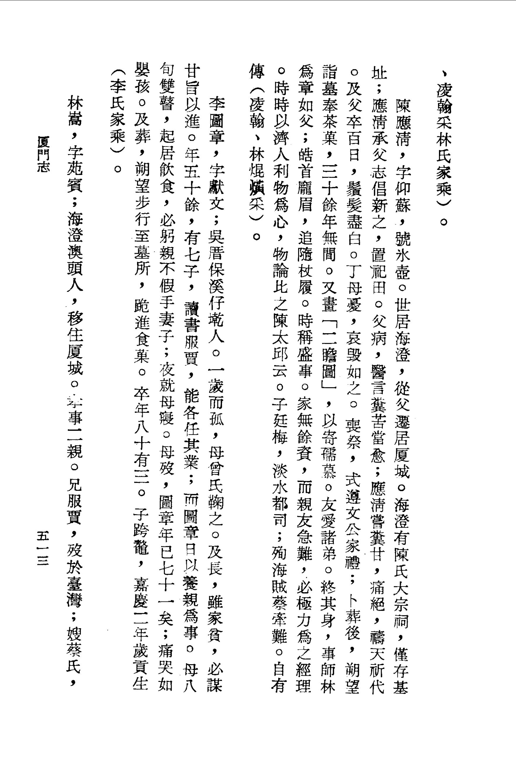 陳應清,字仰蘇,號冰壺。世居海澄,從父遷居廈城。海澄有陳氏大宗祠,僅存基址;應清承父志倡新之,置祀田。父病,醫言糞苦當愈;應清嘗糞甘,痛絕,禱天祈代。及父卒百日,鬚髮盡白。丁母憂,哀毀如之。喪祭,式遵文公家禮;卜葬後,朔望詣墓奉茶菓,三十餘年無間。又畫「二瞻圖」,以寄孺慕。友愛諸弟。終其身,事師林為章如父;皓首龐眉,追隨杖履。時稱盛事。家無餘資,而親友急難,必極力為之經理。時時以濟人利物為心,物論比之陳太邱云。子廷梅,淡水都司;殉海賊蔡牽難。自有傳(凌翰、林焜熿采)。