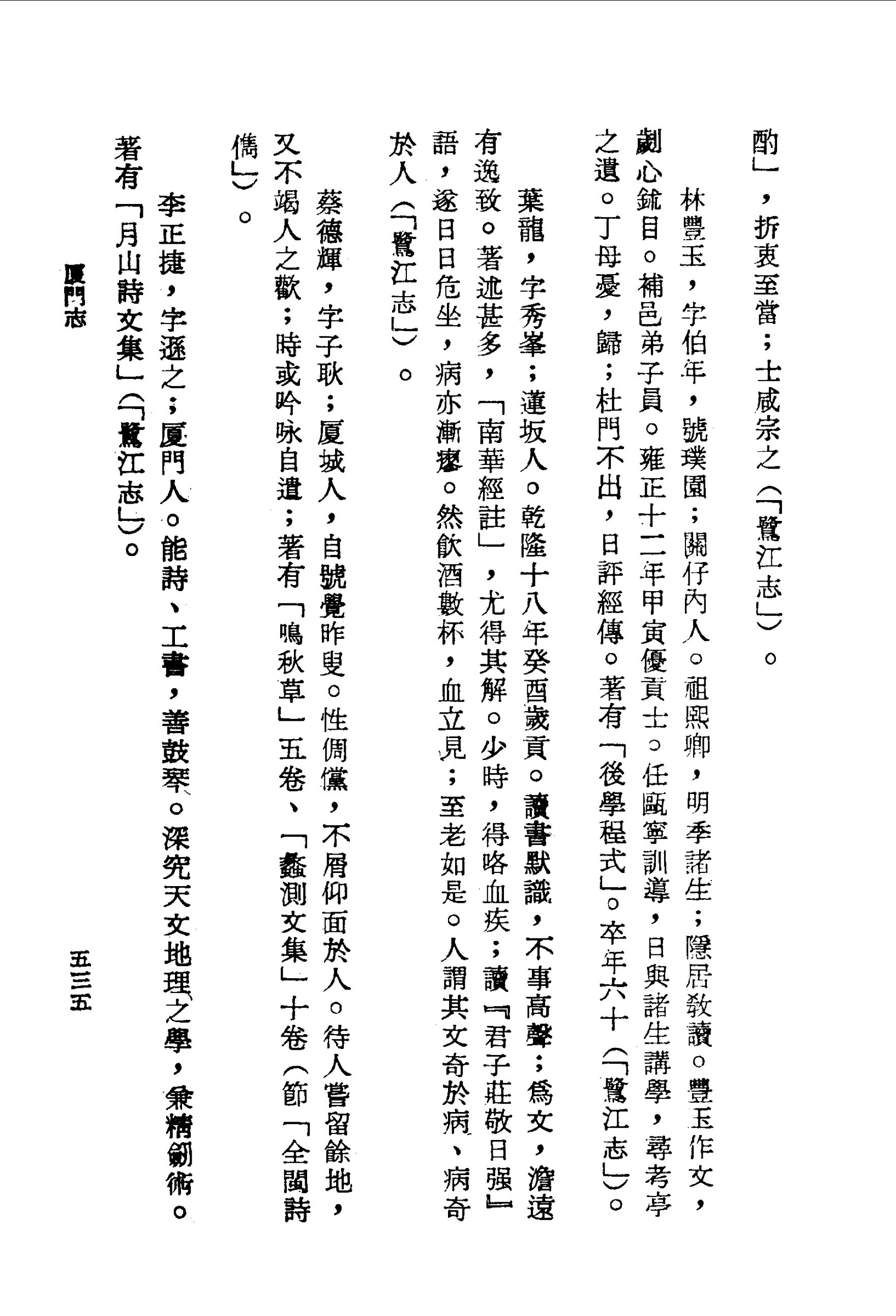 葉龍,字秀峯;蓮坂人。乾隆十八年癸酉歲貢。讀書默識,不事高聲;為文,澹遠有逸致。著述甚多,「南華經註」,尤得其解。少時,得咯血疾;讀『君子莊敬日強』語,遂日日危坐,病亦漸瘳。然飲酒數杯,血立見;至老如是。人謂其文奇於病、病奇於人(「鷺江志」)。