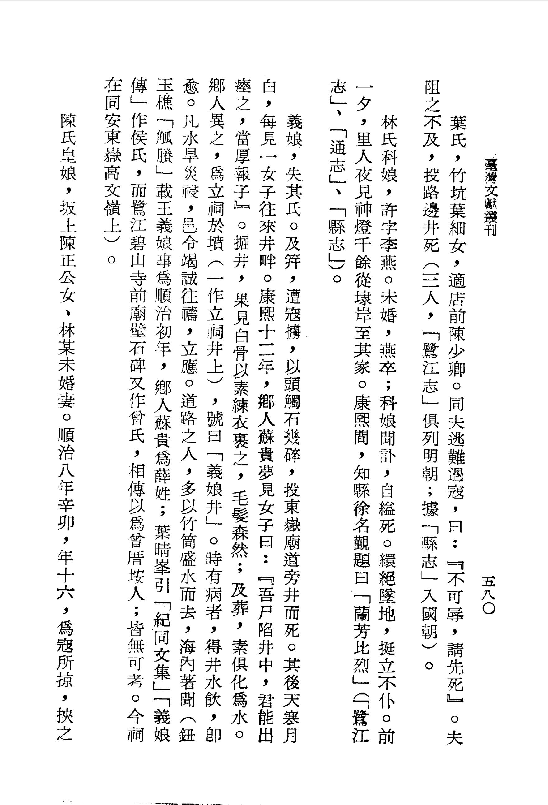 義娘,失其氏.及笄,遭寇擄,以頭觸石幾碎,投東嶽廟道旁井而死.其後天寒月白,每見一女子往來井畔.康熙十二年,鄉人蘇貴夢見女子曰:『吾尸陷井中,君能出瘞之,當厚報子』.掘井,果見白骨以素練衣裹之,毛髮森然;及葬,素俱化為水.鄉人異之,為立祠於墳(一作立祠井上),號曰「義娘井」.時有病者,得井水飲,即愈.凡水旱災祲,邑令竭誠往禱,立應.道路之人,多以竹筒盛水而去,海內著聞(鈕玉樵「觚賸」載王義娘事為順治初年,鄉人蘇貴為薛姓;葉晴峯引「紀同文集」「義娘傳」作侯氏,而鷺江碧山寺前廟壁石碑又作曾氏,相傳以為曾厝垵人;皆無可考.今祠在同安東嶽高文嶺上)。