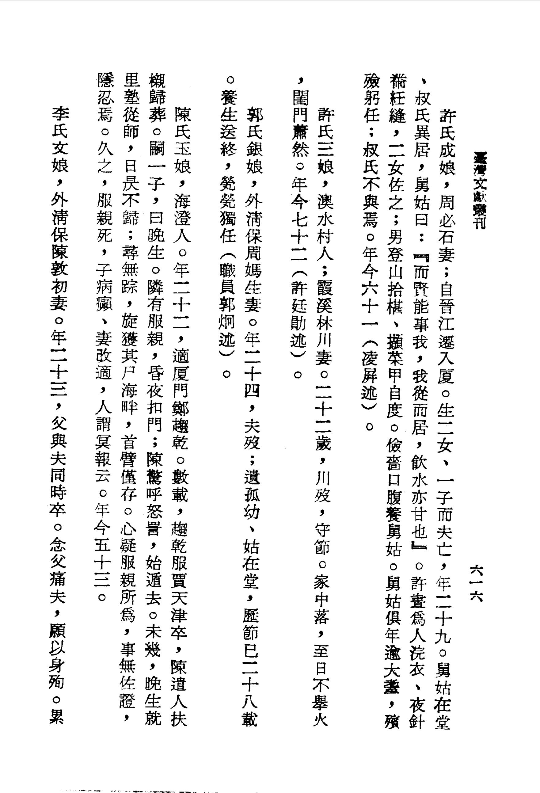 陳氏玉娘,海澄人。年二十二,適廈門鄭趨乾。數載,趨乾服賈天津卒,陳遣人扶櫬歸葬。嗣一子,曰晚生。鄰有服親,昏夜扣門;陳驚呼怒詈,始遁去。未幾,晚生就里塾從師,日昃不歸;尋無蹤,旋獲其尸海畔,首臂僅存。心疑服親所為,事無佐證,隱忍焉。久之,服親死,子病癲、妻改適,人謂冥報云。年今五十三。