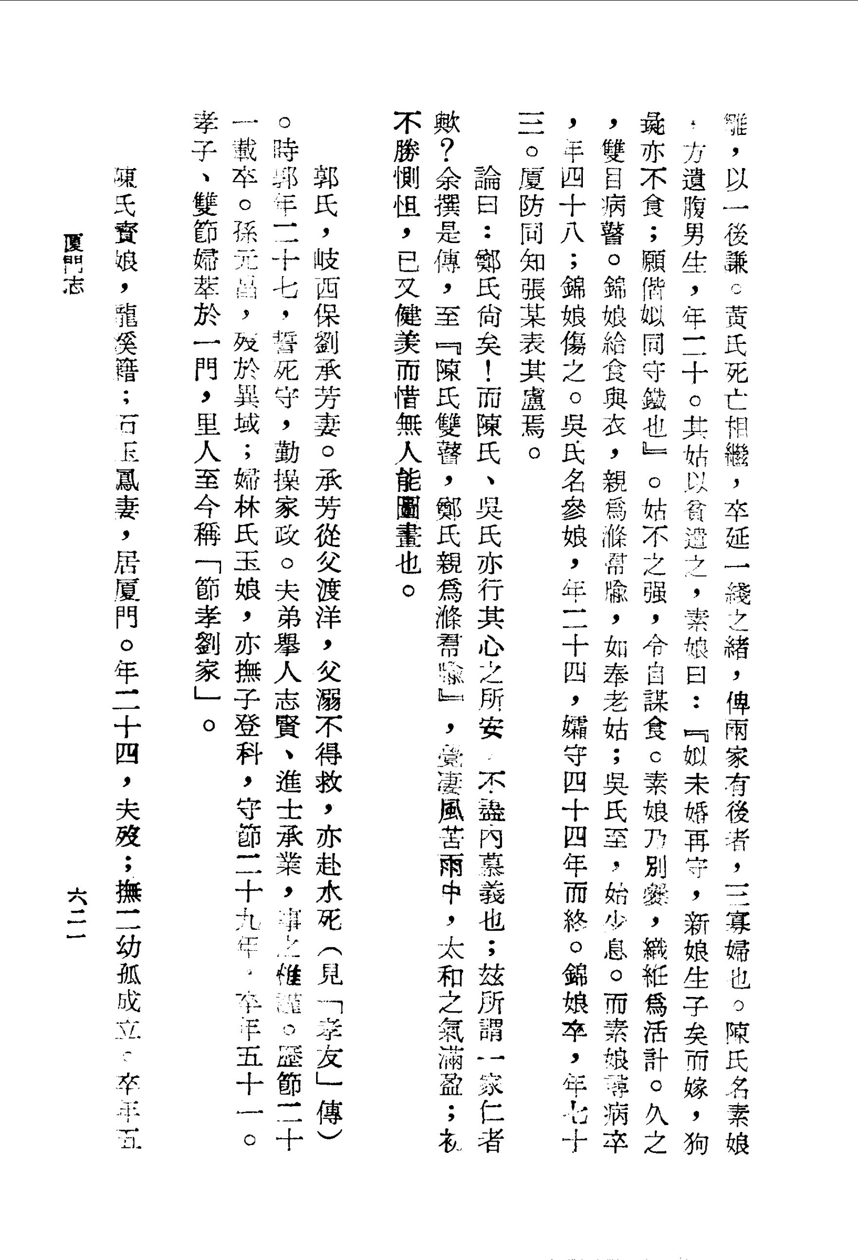 陳氏名素娘,方遺腹男生,年二十。其姑以貧遣之,素娘曰:『姒未婚再守,新娘生子矣而嫁,狗彘亦不食;願偕姒同守鐵也』。姑不之強,令自謀食。素娘乃別爨,織絍為活計。久之,雙目病瞽。錦娘給食與衣,親為滌帬牏,如奉老姑;吳氏至,始少息。而素娘尋病卒,年四十八;錦娘傷之。吳氏名參娘,年二十四,孀守四十四年而終。錦娘卒,年七十三。廈防同知張某表其盧焉。