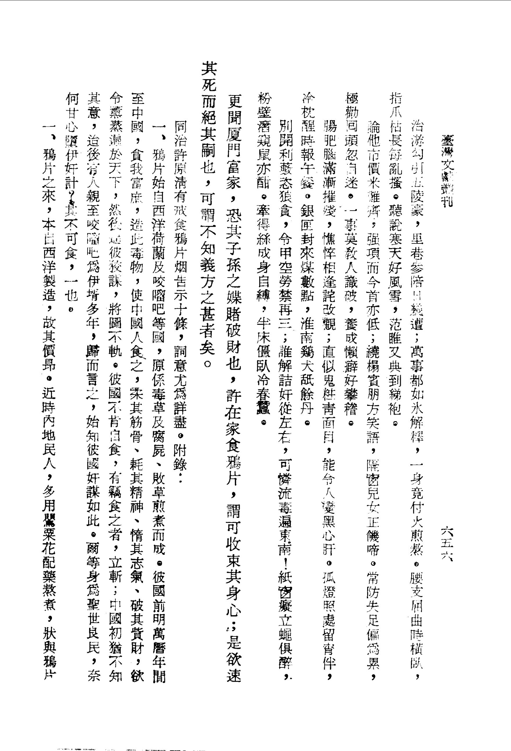 鴉片之來,本自西洋製造,故其價昂。近時內地民人,多用鸎粟花配藥熬煮,狀與鴉片無異,而價稍賤。買食者真偽莫分,但貪價賤而不知其毒更深且速。蓋物賤則易買,易買則食多,食多則引愈大而毒愈深。其不可食,二也。