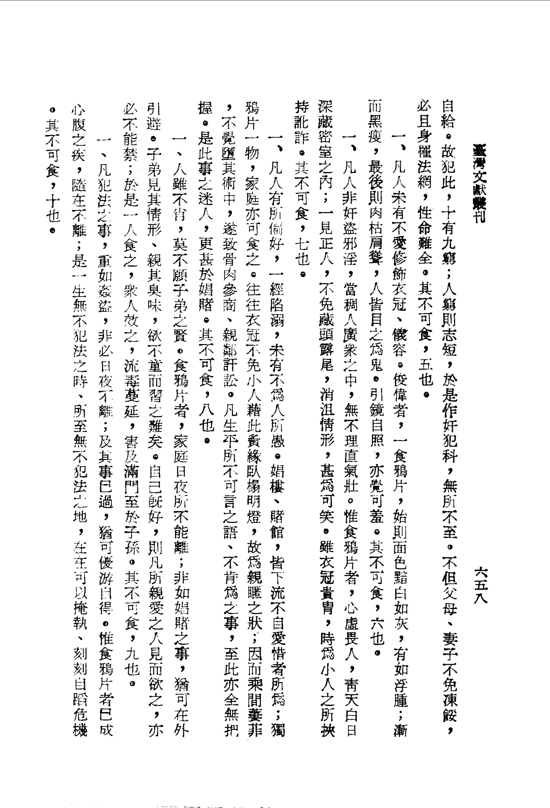 凡犯法之事,重如姦盜,非必日夜不離;及其事已過,猶可優游自得。惟食鴉片者已成心腹之疾,隨在不離;是一生無不犯法之時、所至無不犯法之地,在在可以掩執、刻刻自蹈危機。其不可食,十也。