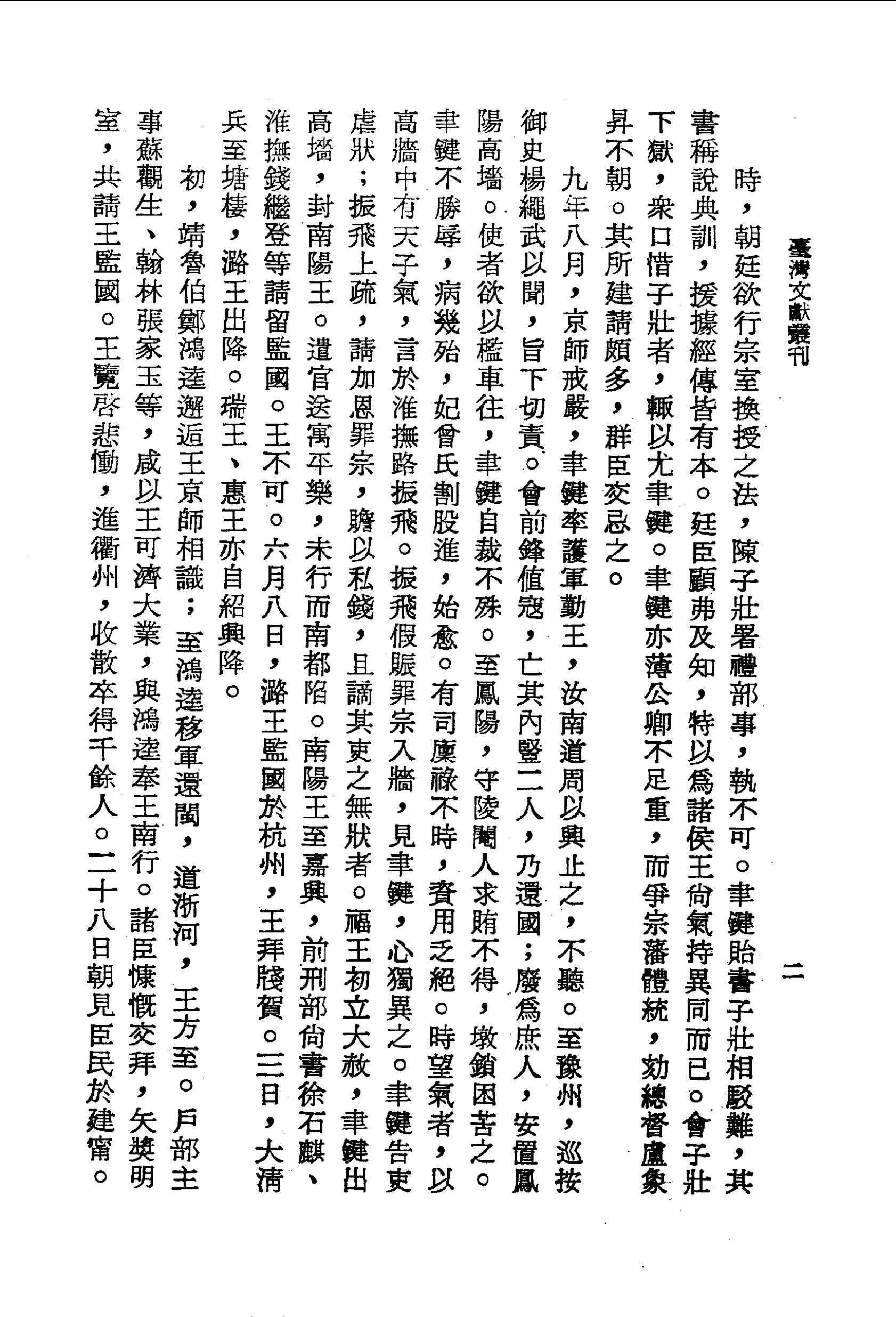 九年八月,京師戒嚴,聿鍵率護軍勤王,汝南道周以興止之,不聽。至豫州,巡按御史楊繩武以聞,旨下切責。會前鋒值寇,亡其內豎二人,乃還國;廢為庶人,安置鳳陽高墻。使者欲以檻車往,聿鍵自裁不殊。至鳳陽,守陵閹人求賄不得,墩鎖困苦之。聿鍵不勝辱,病幾殆,妃曾氏割股進,始愈。有司廩祿不時,資用乏絕。時望氣者,以高牆中有天子氣,言於淮撫路振飛。振飛假賑罪宗入牆,見聿鍵,心獨異之。聿鍵告吏虐狀;振飛上疏,請加恩罪宗,贍以私錢,且謫其吏之無狀者。福王初立大赦,聿鍵出高牆,封南陽王。