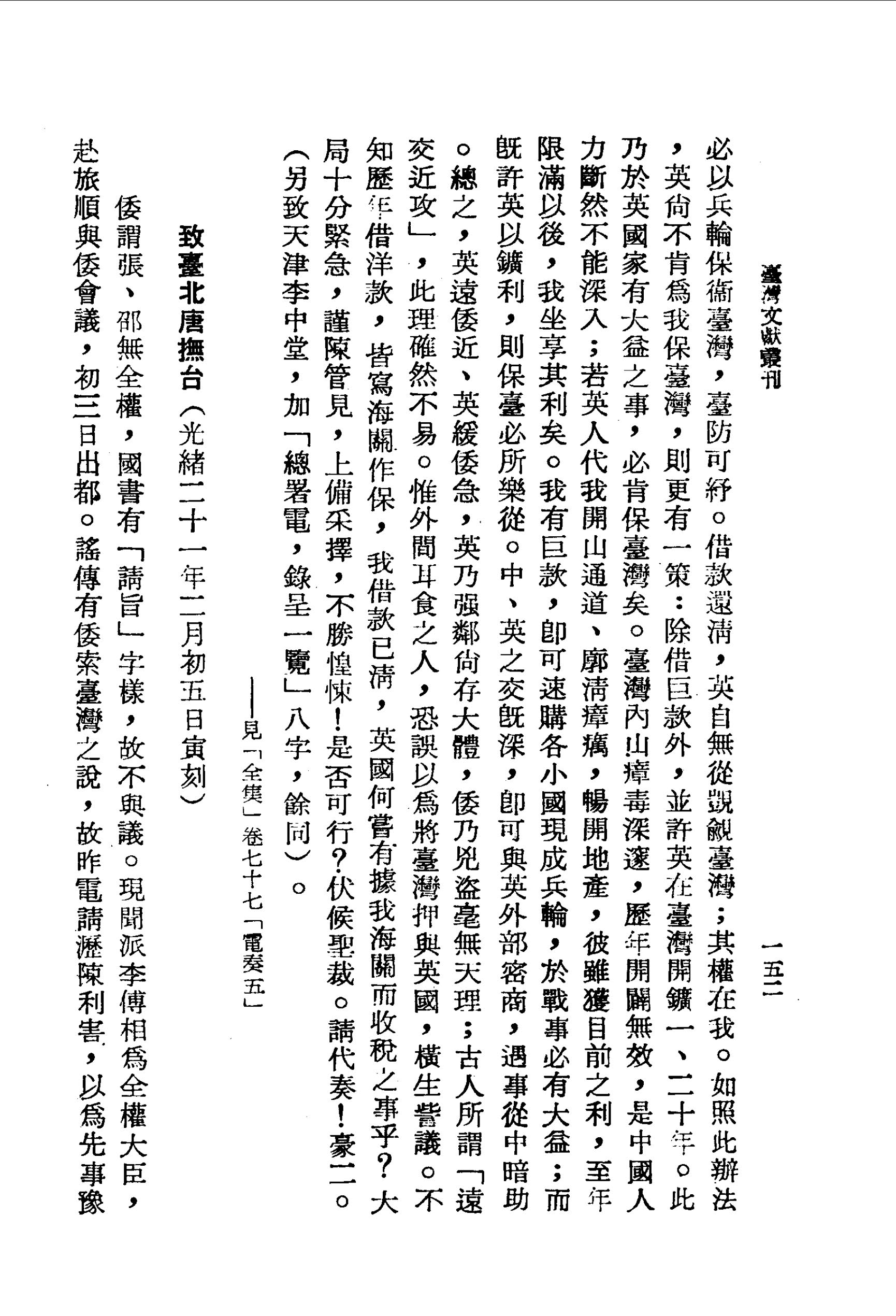 再,近日倭有數輪游弋澎湖,顯係意在臺灣,甚屬孤危可慮。竊謂此時正可就外洋豔羨之意,另設一權宜救急之法,似可與英公使、外部商之,即向英借款二、三千萬,以臺灣作保;臺灣既以保借款,英必不肯任倭人盜踞,英自必以兵輪保衛臺灣,臺防可紓。借款還清,英自無從覬覦臺灣;其權在我。如照此辦法,英尚不肯為我保臺灣,則更有一策:除借巨款外,並許英在臺灣開鑛一、二十年。此乃於英國家有大益之事,必肯保臺灣矣。臺灣內山瘴毒深邃,歷年開闢無效,是中國人力斷然不能深入;若英人代我開山通道、廓清瘴癘,暢開地產,彼雖獲目前之利,至年限滿以後,我坐享其利矣。我有巨款,即可速購各小國現成兵輪,於戰事必有大益;而既許英以鑛利,則保臺必所樂從。中、英之交既深,即可與英外部密商,遇事從中暗助。總之,英遠倭近、英緩倭急,英乃強鄰尚存大體,倭乃兇盜毫無天理;古人所謂「遠交近攻」,此理確然不易。