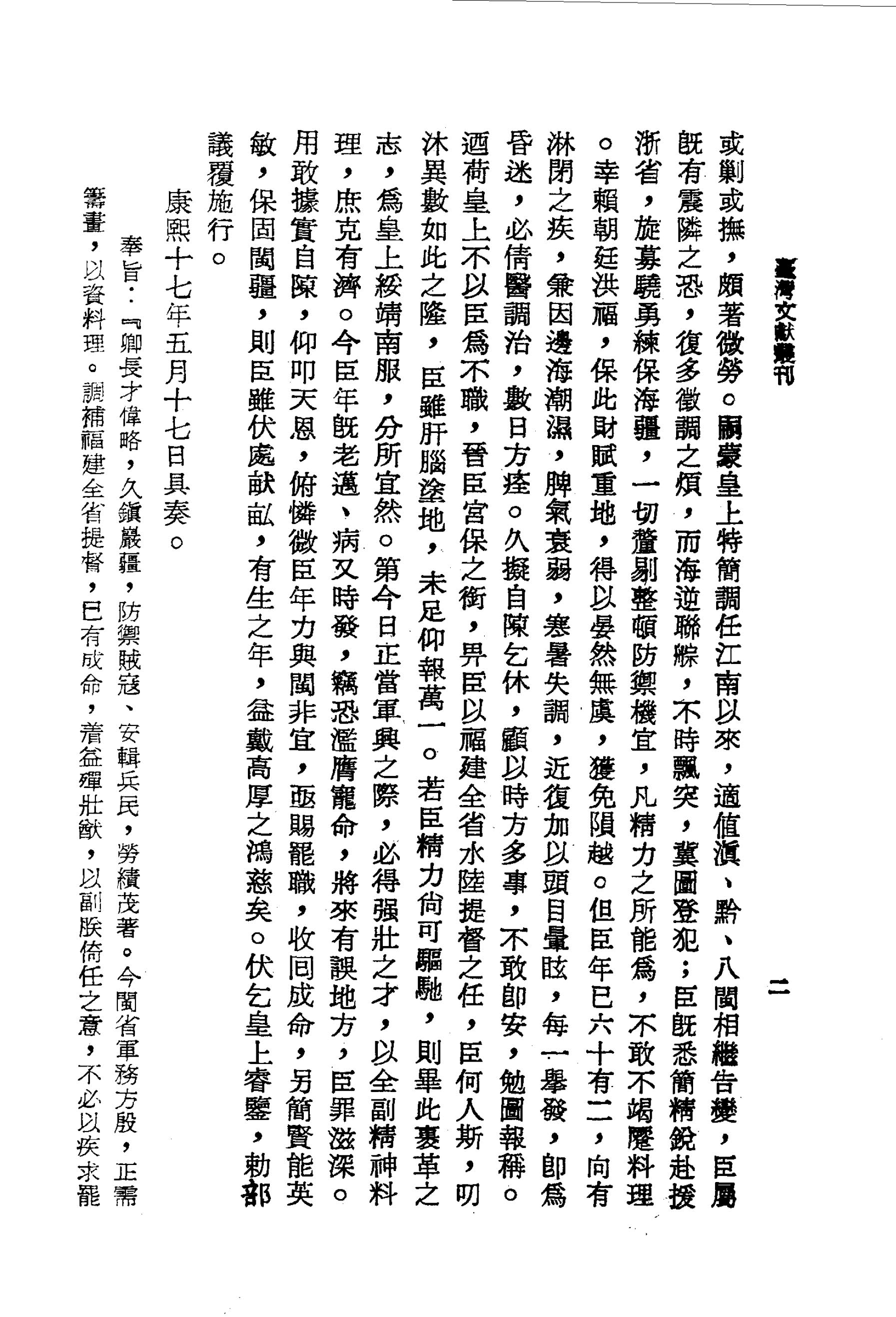 但臣年已六十有二,向有淋閉之疾,兼因邊海潮濕,脾氣衰弱,寒暑失調,近復加以頭目暈眩,每一舉發,即為昏迷,必倩醫調治,數日方痊。久擬自陳乞休,顧以時方多事,不敢即安,勉圖報稱。