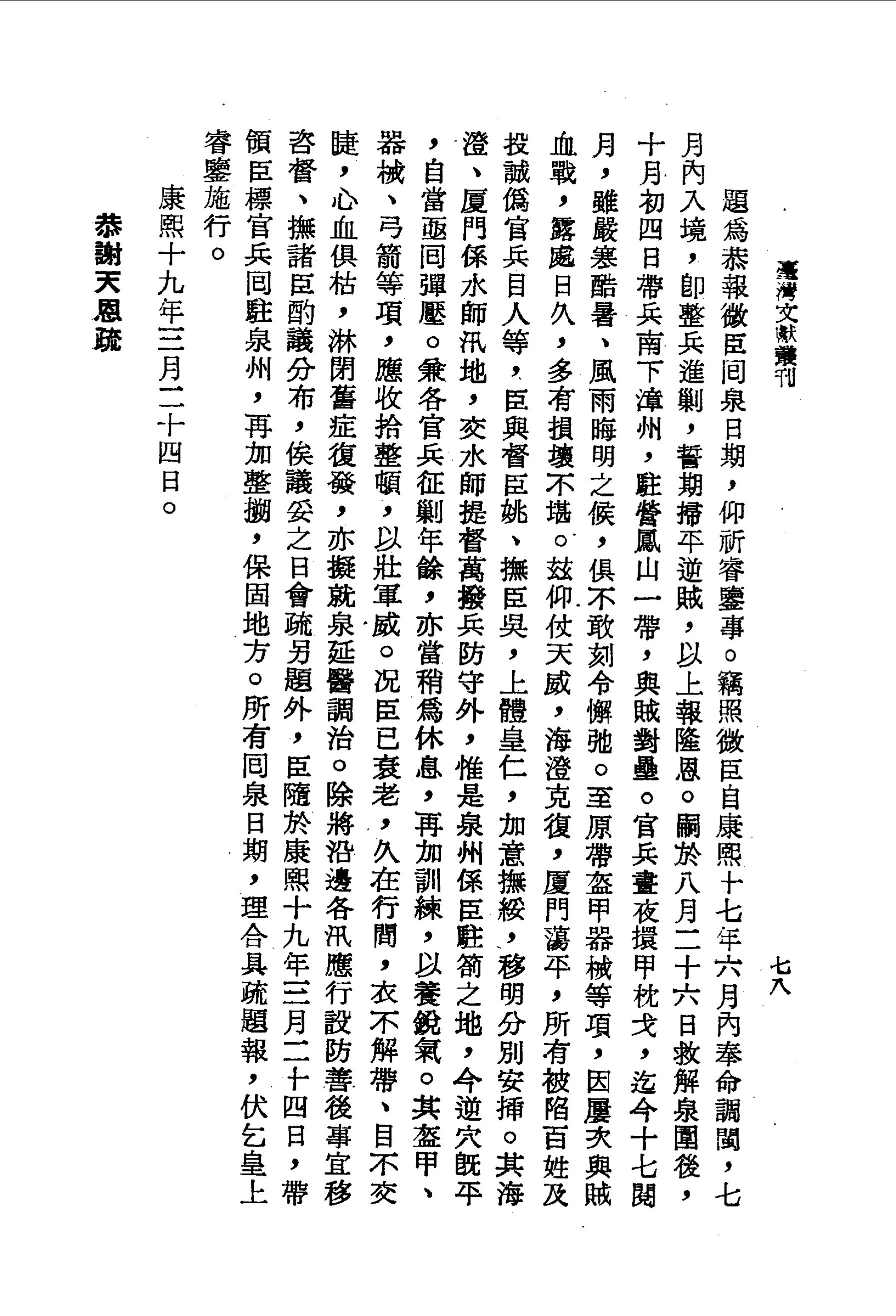 況臣已衰老,久在行間,衣不解帶、目不交睫,心血俱枯,淋閉舊症復發,亦擬就泉延醫調治。除將沿邊各汛應行設防善後事宜移咨督、撫諸臣酌議分布,俟議妥之日會疏另題外,臣隨於康熙十九年三月二十四日,帶領臣標官兵回駐泉州,再加整搠,保固地方。所有回泉日期,理合具疏題報,伏乞皇上睿鑒施行。
