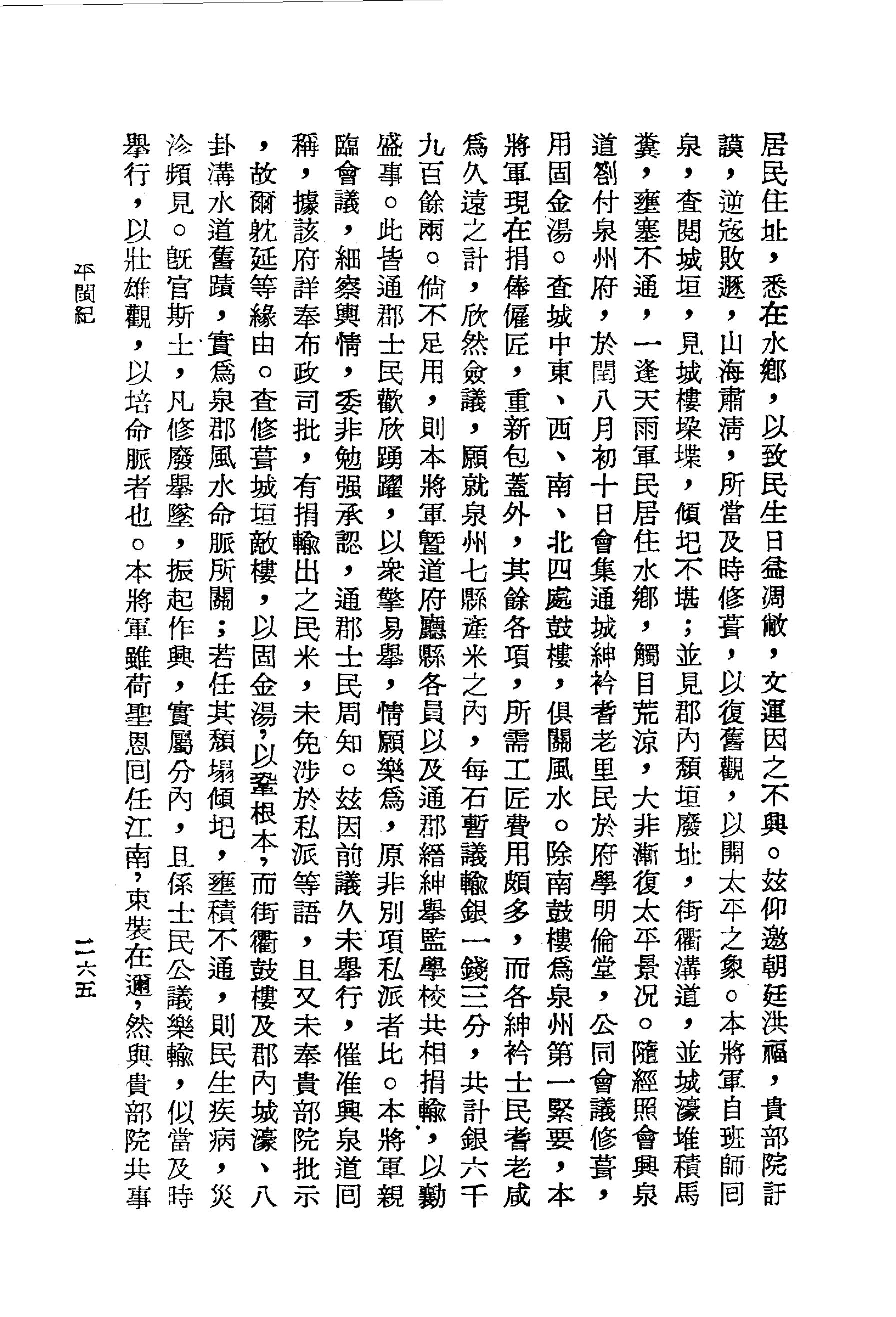 再查城內東、西、南、北四處,原各設有鼓樓。昔人建造,皆按地理,其有關於闔郡風水可知。今倒塌者則殘石擁塞通衢,破損者則椽瓦不蔽風雨;更兼街中水道不通,每遇天雨,淤泥壅積,竟至水深數尺,舖戶居民,臨流愁歎,不特行走不便,亦多重膇疾病之虞。且水道壅遏,則文運不興,所關尤為不小。本將軍駐節茲土,幸與貴道共事一方,既與斯民掃除寇虐,尤不可不為地方修葺規模。