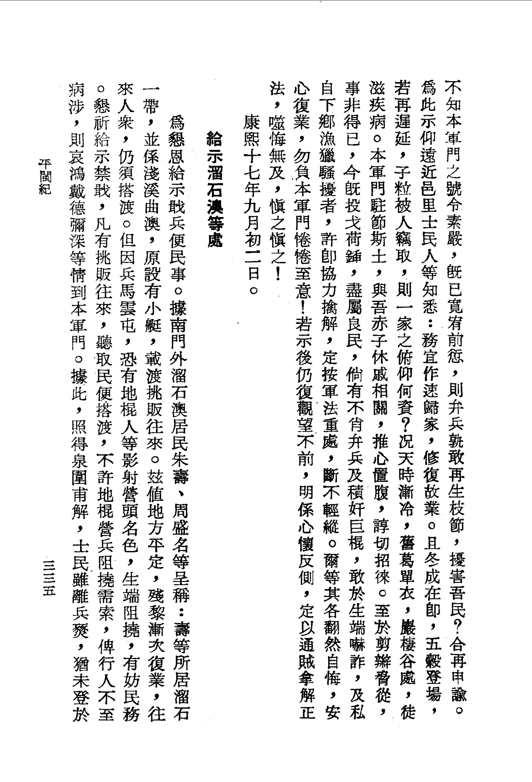 為此示仰遠近邑里士民人等知悉:務宜作速歸家,修復故業。且冬成在即,五穀登場,若再遲延,子粒被人竊取,則一家之俯仰何資?況天時漸冷,舊葛單衣,巖棲谷處,徒滋疾病。本軍門駐節斯土,與吾赤子休戚相關,推心置腹,諄切招徠。